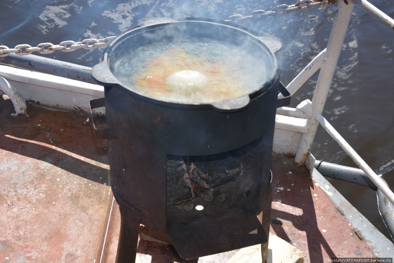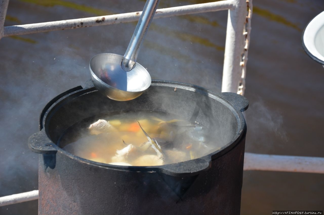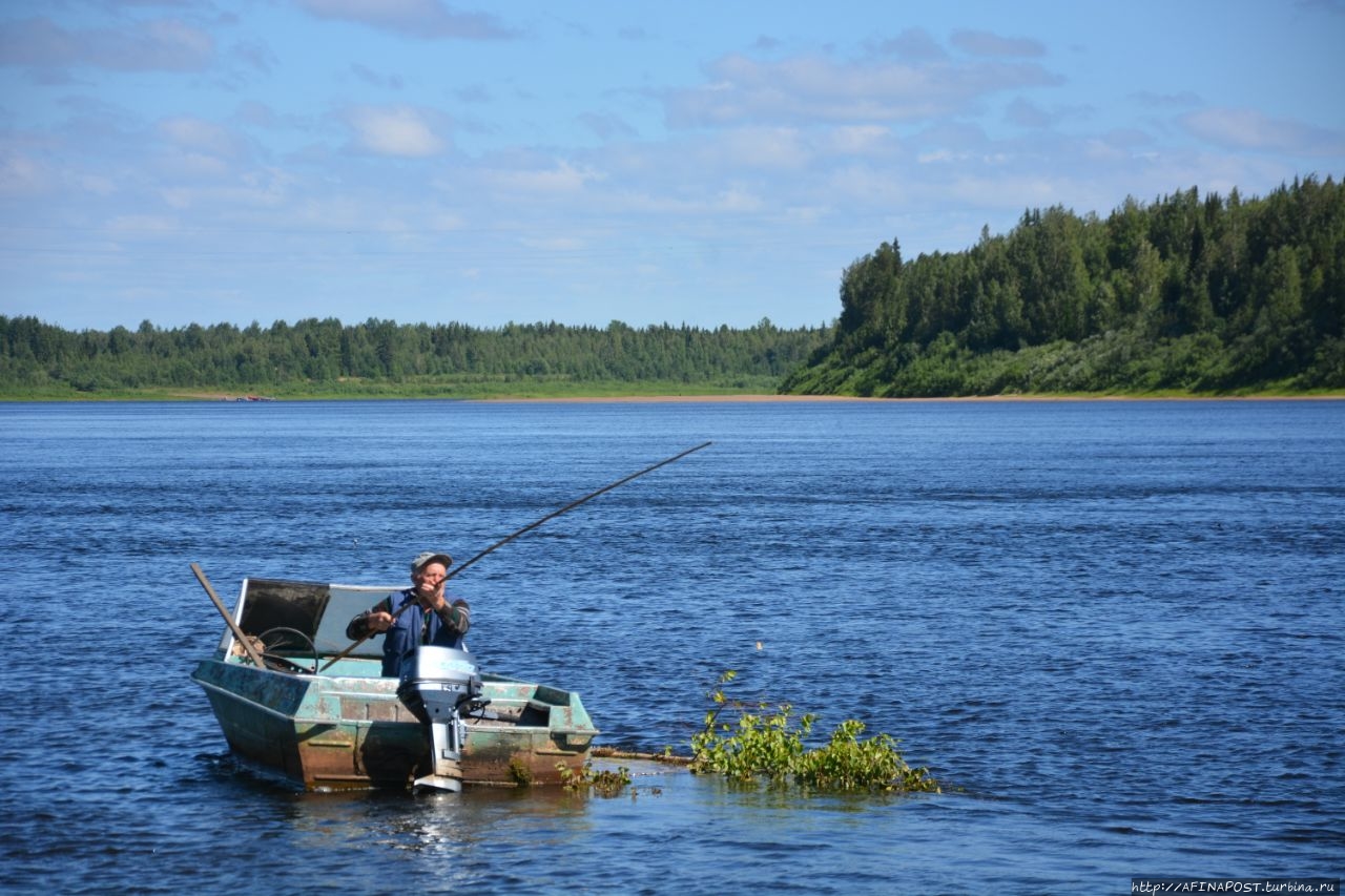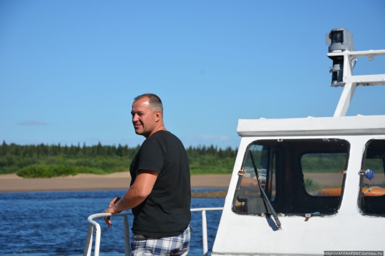 Пока мы будем гулять, капитан сварит на обед рыбацкую уху из печорской рыбки. Дед-рыбак уже поджидал нас в своей лодке.