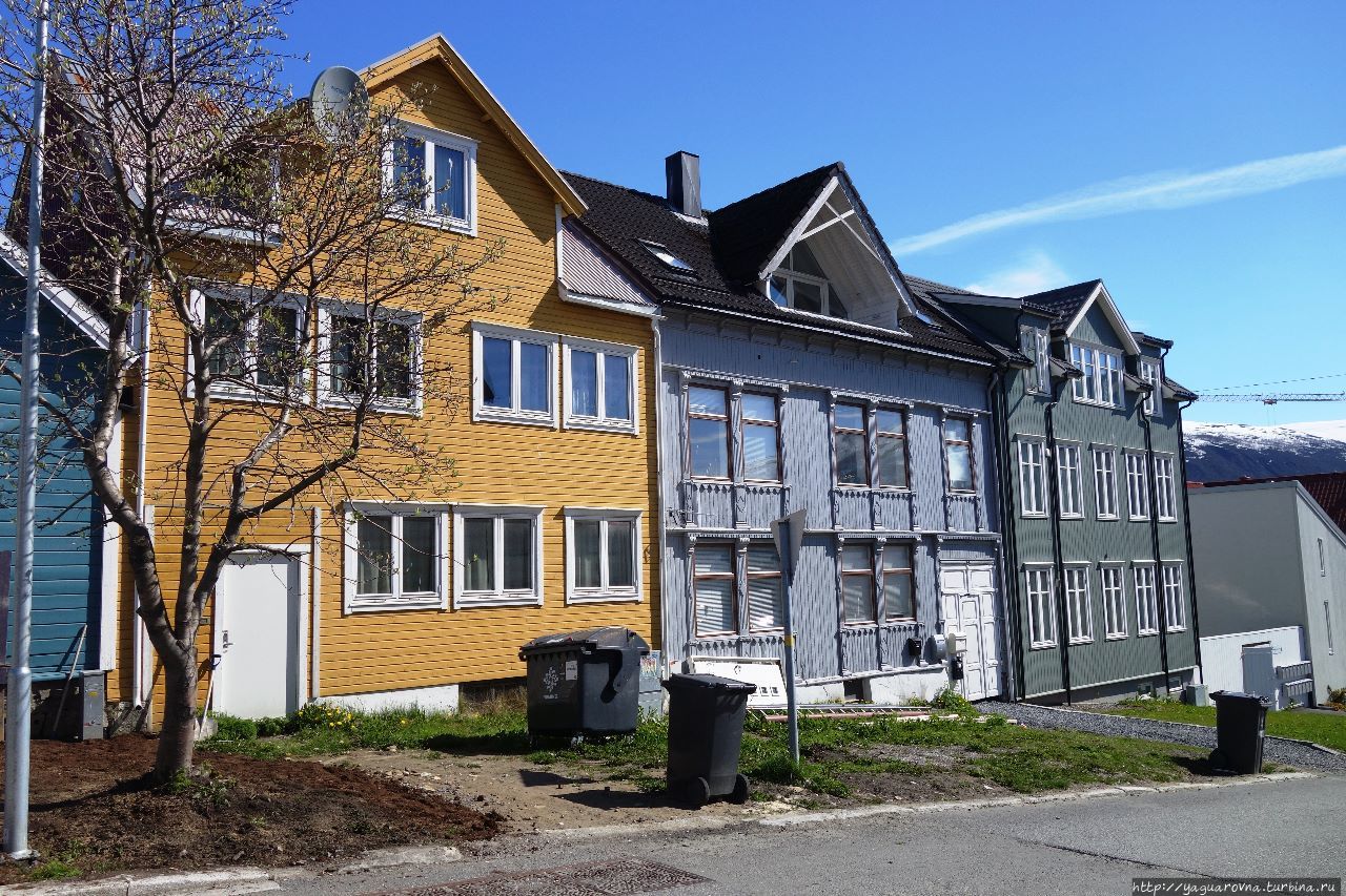 Когда перед нами, наконец, распростерлись улицы Тромсё, оказалось, что владельцы домиков имеют разнообразные вкусы относительно расцветки имущества. Часть из них явно предпочитала приглушенные тона серо-голубых, зеленых и охристых оттенков. И в основном такие здания располагались по левой от нас стороне дороги, ближе к воде.