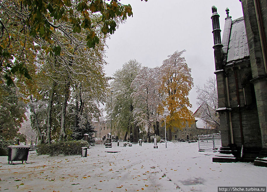 Кафедральный собор Нидаросс - место коронации королей Он изначально был постоен на высокой косе над рекой. Весь склон к реке заполняют высокие деревья. Не знаю, это остатки дикого леса, или насаженный парк, но все выглядит очень ухоженно. Между этими деревьями в изобилии находятся надгробные плоские камни. Но при этом ощущения, что гуляешь по кладбищу не возникает. Там нет оградок, нет выраженных могильных холмов. Ощущения, лично у меня, как прогулка по историческому скверу.