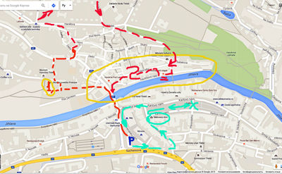 Мы припарковались в месте, отмеченным синей буквой Р. Потом очень уверенно добрались до собора Прокопа, отмеченного красной 1. А вот далее, вместо того, что бы просто пройти в еврейский квартал (красная 2, обведенная желтым овалом), меня почему то унесло вверх на север (и это совпало с местным рельефом, и мы действительно сильно поднялись вверх). Там я и прогулял минут 40, пока не сориентировался при помощи навигатора. Но нет худа без добра. В награду я получил несколько панорамных фото с видом на собор, и на знаменитый квартал.