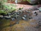 Спустившись вниз по лестнице, мы оказываемся в небольшом ущелье из красного прессованного песчаника.