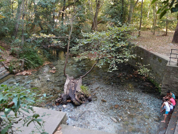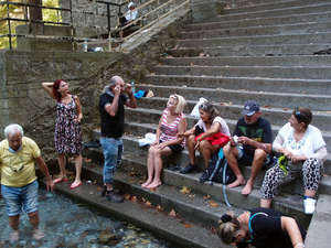 Из бассейна вода вытекает дальше, создавая мелкое озерцо, в котором паломники купаются. Ну, или просто омывают ноги. Водица уж очень холодная!