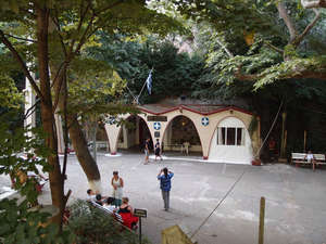 Отправляясь к скальному храму, важно не пропустить единственную стоянку машин в местечке Агиа Параскеви, от которого дальнейший путь можно проделать только пешком. Сначала придется пройти небольшой туннель, вроде подземного перехода, под сводами которого, как водится, идет бойкая торговля сувенирами и бутылочками для святой воды из источника. Затем, к церкви Св.Параскевы можно перейти по подвесному мосту, переброшенному через ущелье.