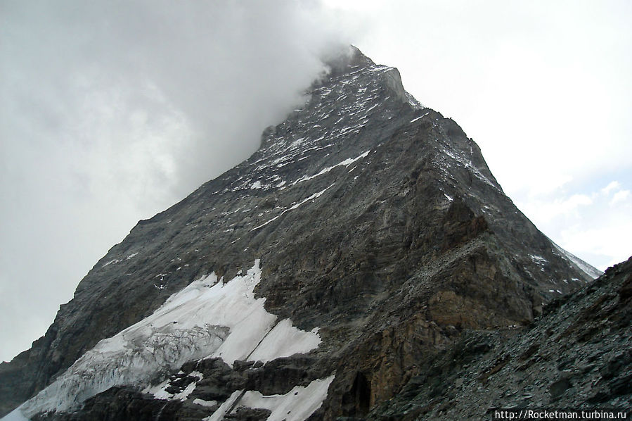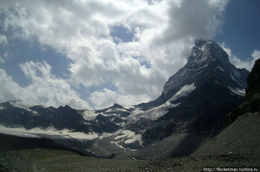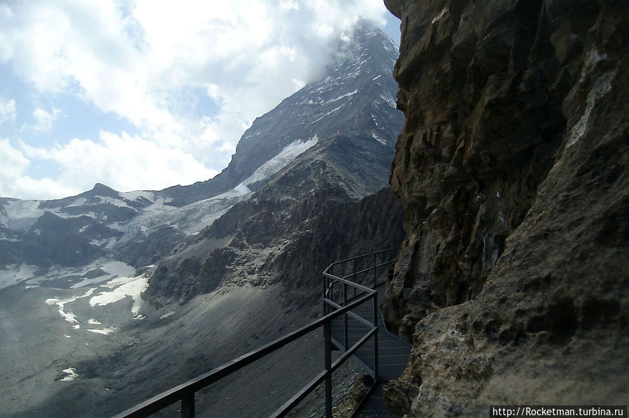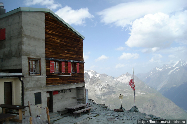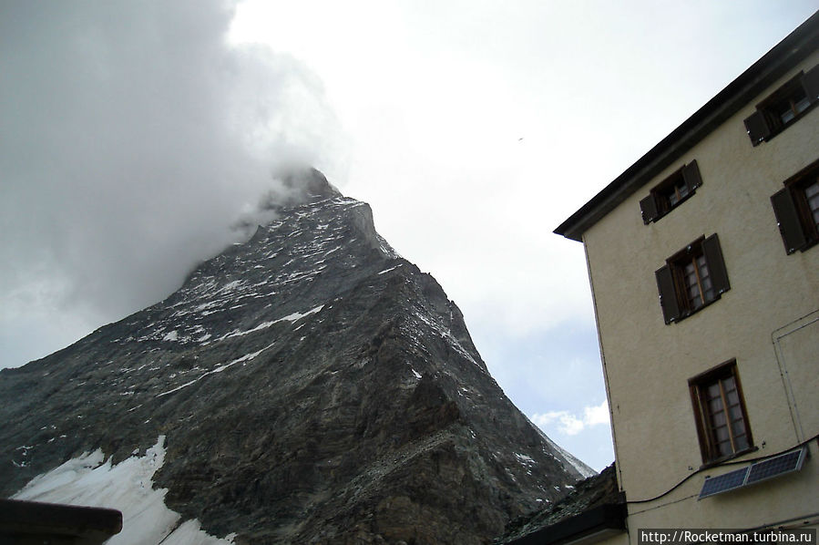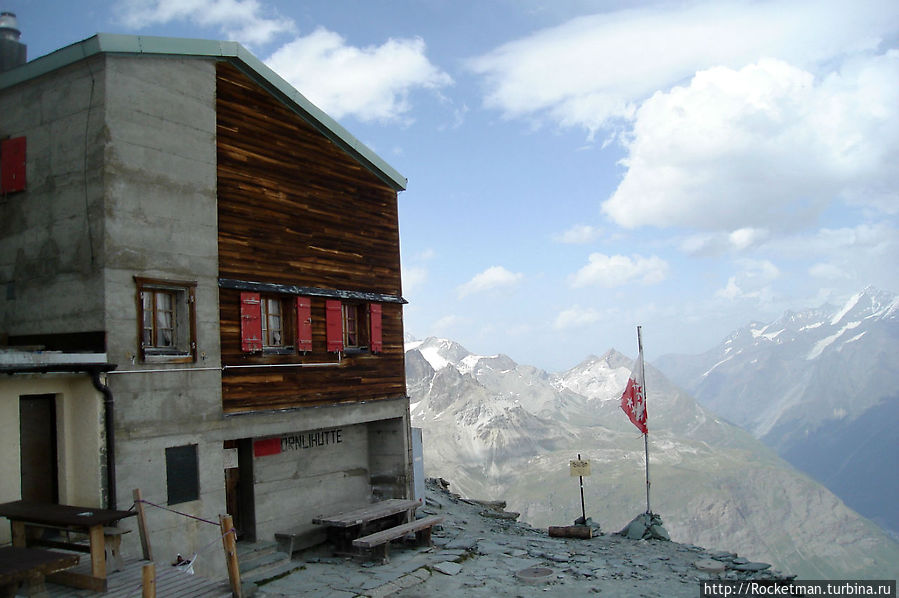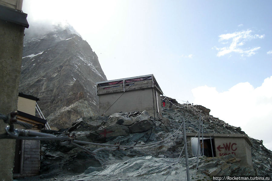 Спустя 700 метров перепада высот и примерно часа подъема я пришел таки к приюту Хернлихутт. Он действительно стоит на краю гребня и сразу за ним Маттерхорн забирает резко вверх. Я подошел к нему вплотную. Что ж, надеюсь, однажды я продвинусь и дальше. Сел на террасе за столик, достал телефон набрал номер и ..