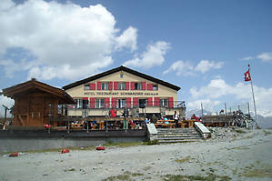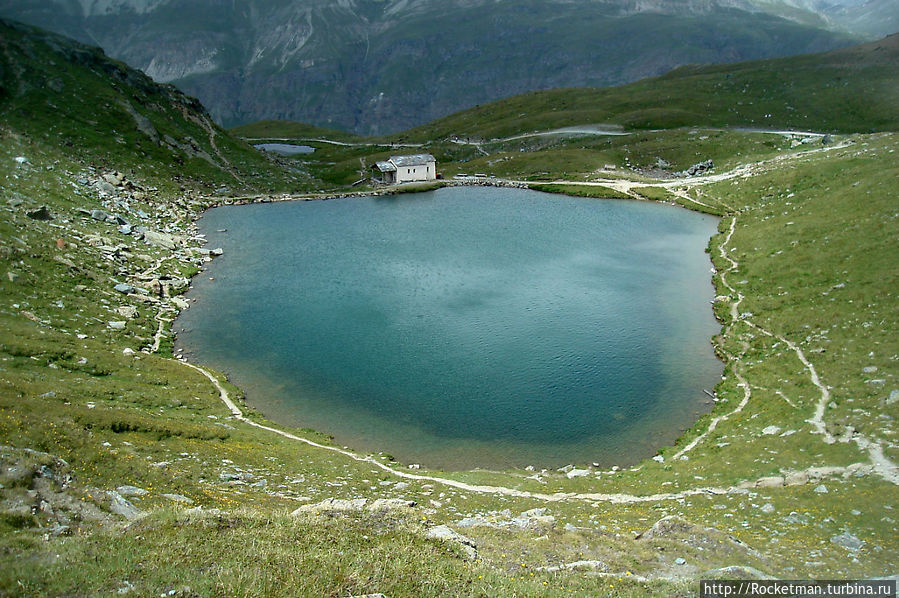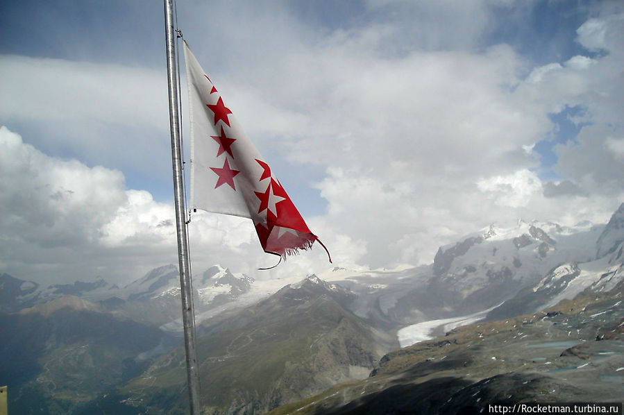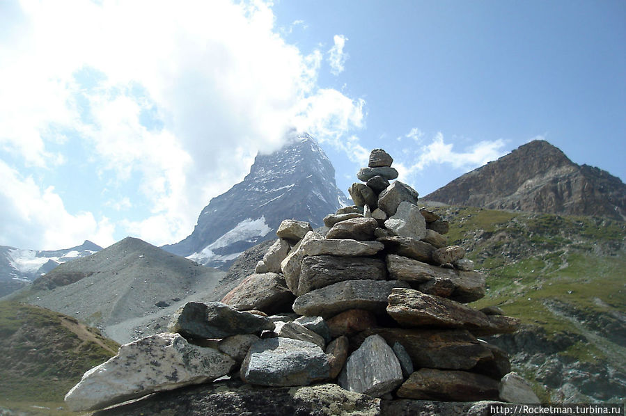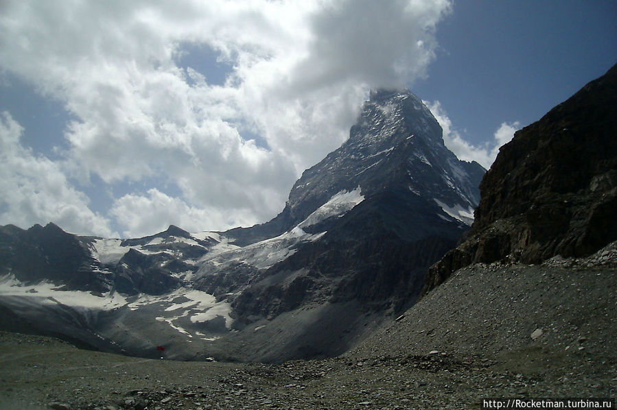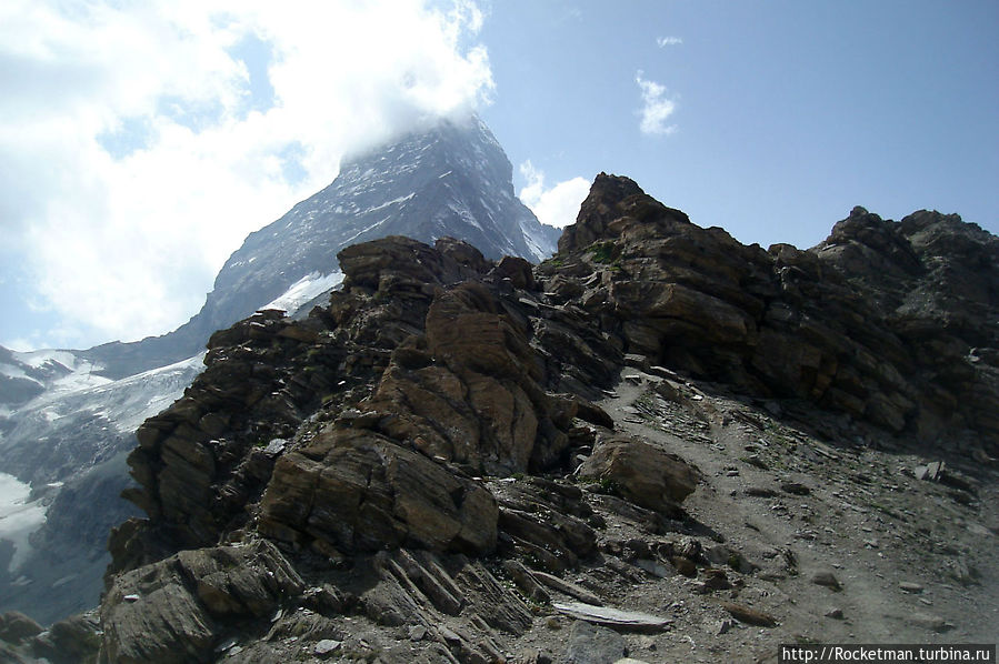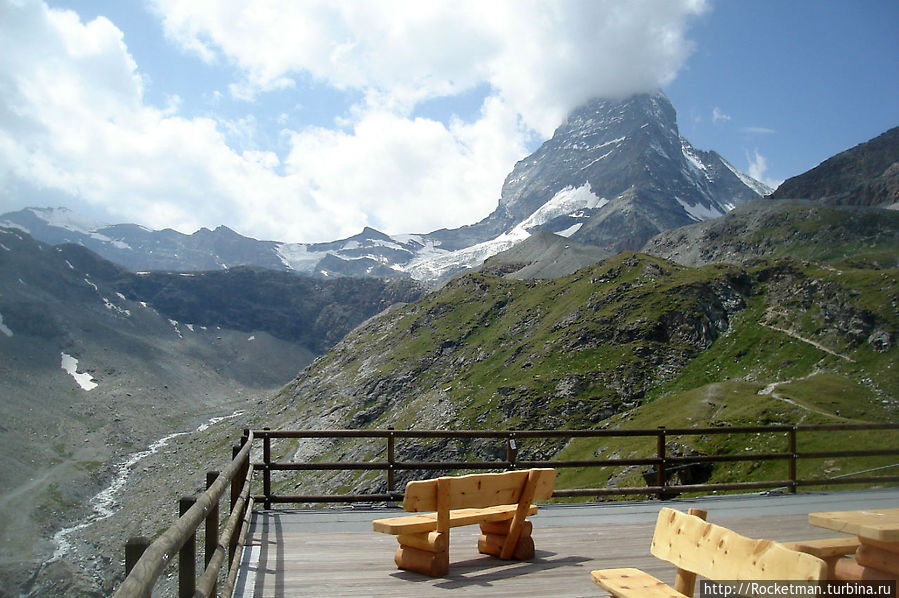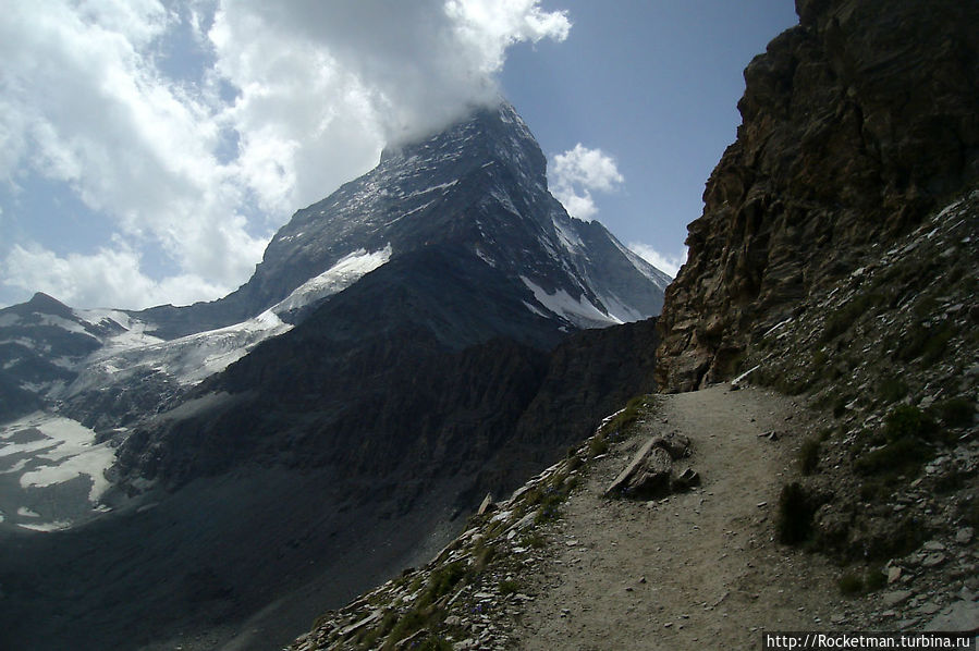 Спустя 700 метров перепада высот и примерно часа подъема я пришел таки к приюту Хернлихутт. Он действительно стоит на краю гребня и сразу за ним Маттерхорн забирает резко вверх. Я подошел к нему вплотную. Что ж, надеюсь, однажды я продвинусь и дальше. Сел на террасе за столик, достал телефон набрал номер и ..