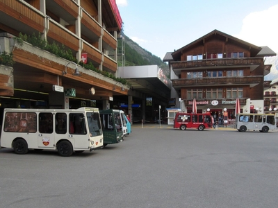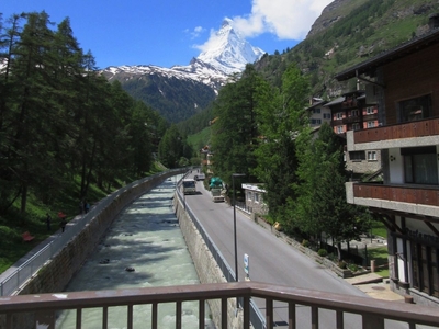 До Церматта доехать на автомобиле с двигателем внутреннего сгорания не позволили, только до деревни Теш, а дальше на выбор: электробус, конный экипаж или поезд. Берегут воздух курорта. Выбрал поезд. Маттерхорн скрывался до последнего. И только в Церматте, выйдя из здания вокзала на привокзальную площадь, увидел верхушку этого красавца.