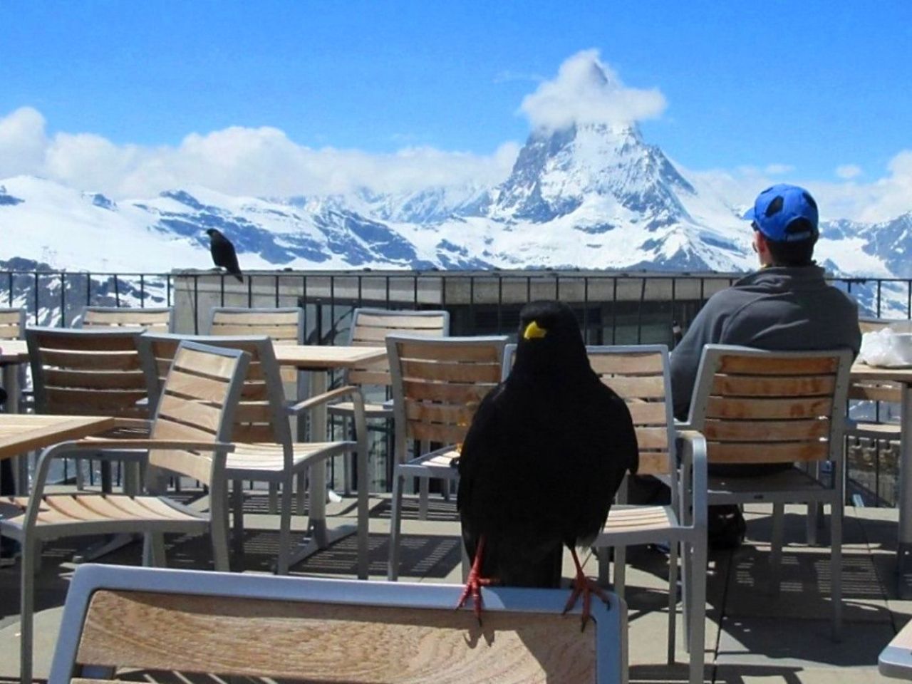 А после этого коллективного воздевания рук — шампанское на террасе ресторана с видом на Маттерхорн. Подлетела наглая Альпийская галка.