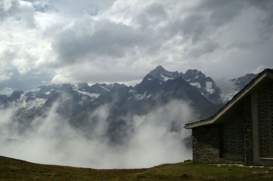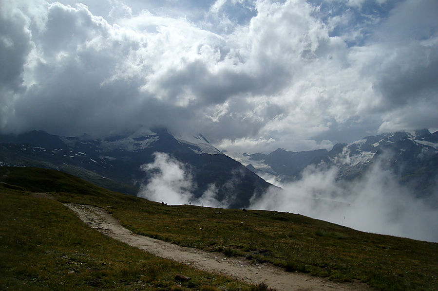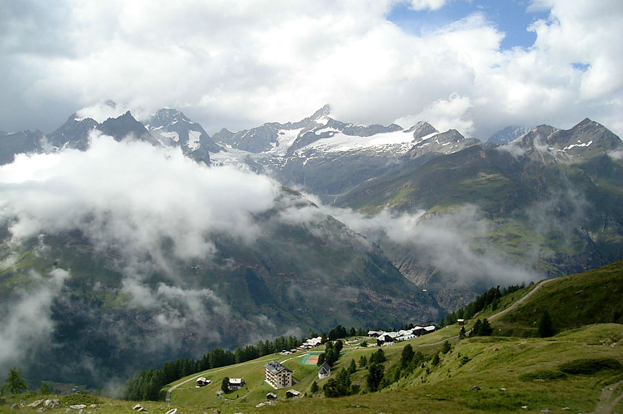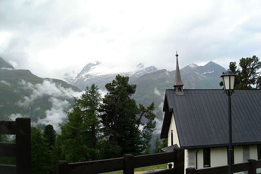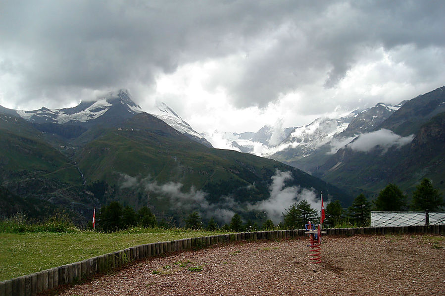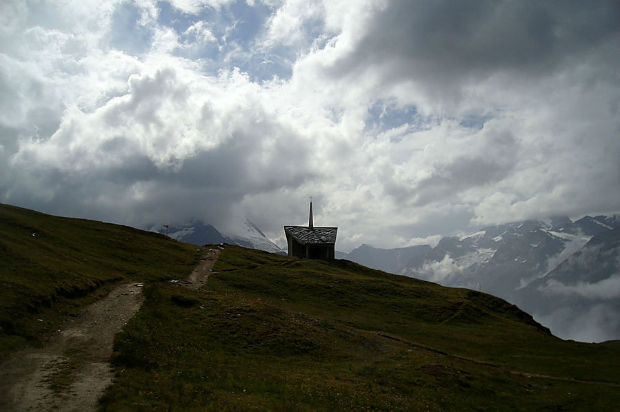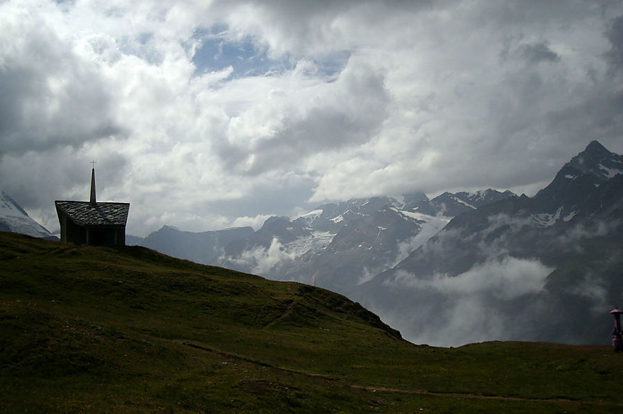 Здесь на склонах зимой катаются лыжники и сноубордисты, судя по разметке трасс. Стоит шале Рифенальп, всем видом дающее понять, что здесь ахренеть как дорого жить. Но катнуть зимой на доске здесь я бы не прочь. Сразу за шале заканчивается лесополоса и начинается открытая местность. До сих пор совершенно не понятно, сколько до вершины, а указатели всегда пишут время только для медлительных туристов. Спустя некоторое время пришел к приюту-ресторану Рифельберг. Сделал передых. Тут тусовался народ, даже какие то китайские дети. Решил пройти еще дальше, на часах было уже около 16.00. Значит в туманной перспективе на Горнерграте я был бы к 18.30, а обратно около 21-22.00 в полнейшей темноте, одиночестве, под дождем и грозой. Очень сомнительная перспектива, так что минут через 20, сидя на смотровой скамейке, возле церквушки, я пришел к выводу "лучше тут подольше посижу". Как раз к этому моменту тучи на некоторое время рассеялись и обнажили свои красоты. Вчерашний Хернли виден был как на ладони, вон и ресторан, где вчера я так мило провел время, а за всем этим выглядывает Солнце, такое яркое и теплое.