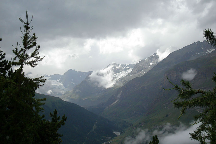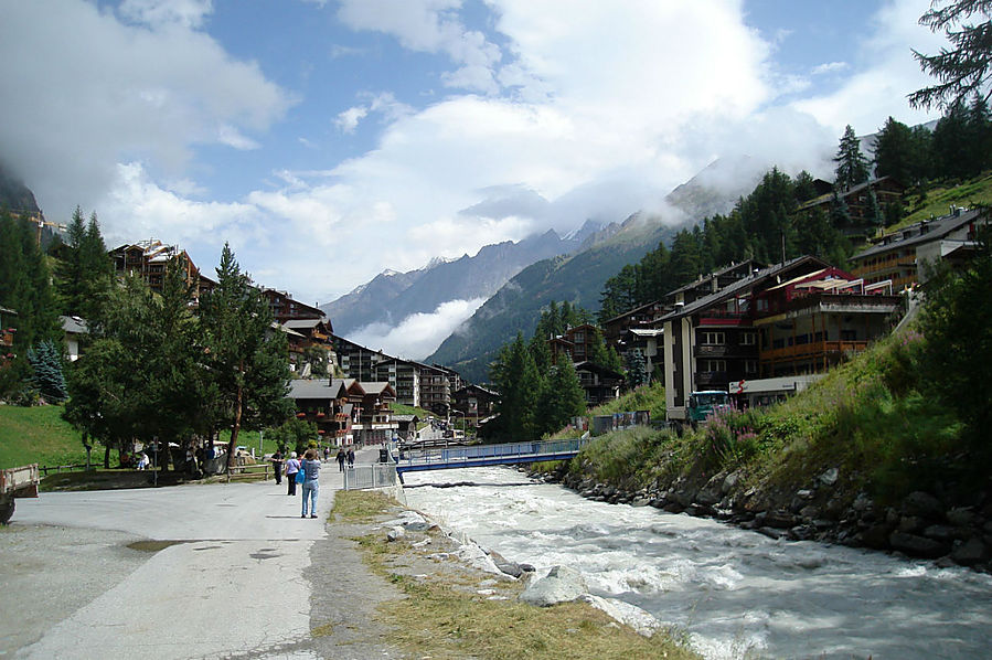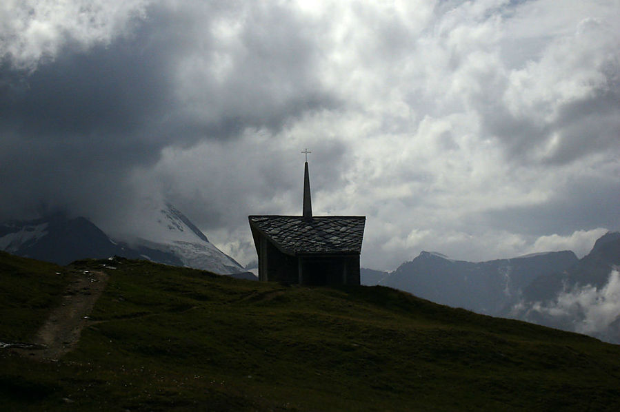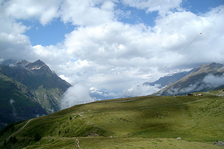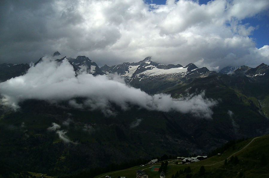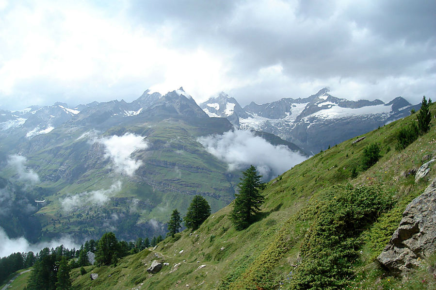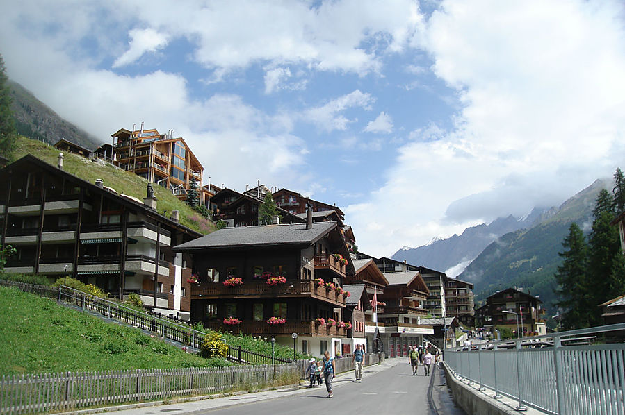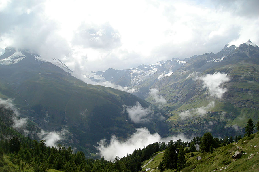 Здесь на склонах зимой катаются лыжники и сноубордисты, судя по разметке трасс. Стоит шале Рифенальп, всем видом дающее понять, что здесь ахренеть как дорого жить. Но катнуть зимой на доске здесь я бы не прочь. Сразу за шале заканчивается лесополоса и начинается открытая местность. До сих пор совершенно не понятно, сколько до вершины, а указатели всегда пишут время только для медлительных туристов. Спустя некоторое время пришел к приюту-ресторану Рифельберг. Сделал передых. Тут тусовался народ, даже какие то китайские дети. Решил пройти еще дальше, на часах было уже около 16.00. Значит в туманной перспективе на Горнерграте я был бы к 18.30, а обратно около 21-22.00 в полнейшей темноте, одиночестве, под дождем и грозой. Очень сомнительная перспектива, так что минут через 20, сидя на смотровой скамейке, возле церквушки, я пришел к выводу "лучше тут подольше посижу". Как раз к этому моменту тучи на некоторое время рассеялись и обнажили свои красоты. Вчерашний Хернли виден был как на ладони, вон и ресторан, где вчера я так мило провел время, а за всем этим выглядывает Солнце, такое яркое и теплое.