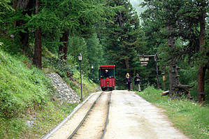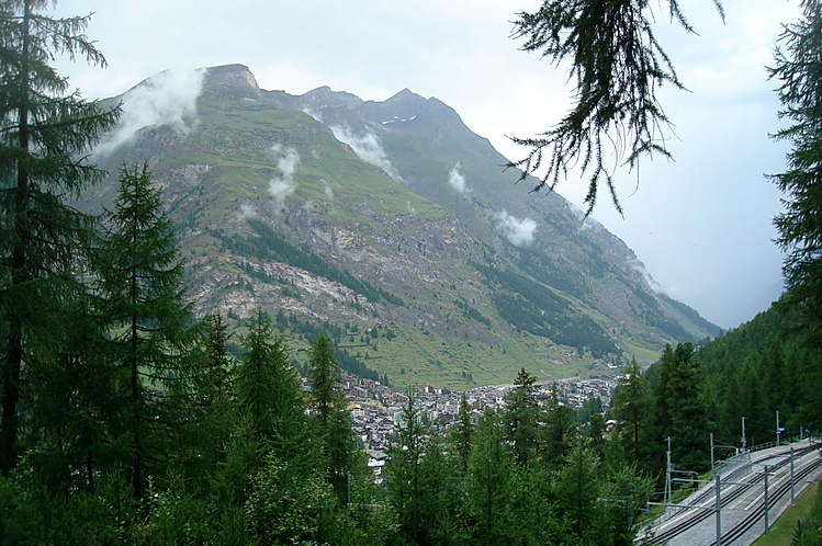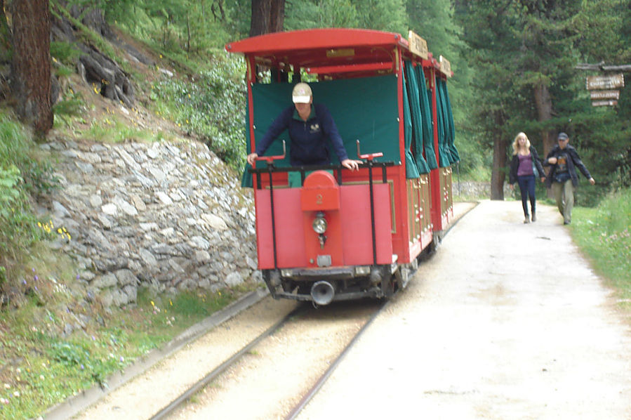 Лесная тропа по началу маленькими траверсами вела сквозь лес наверх по стене, все время виден Церматт. Пересек Горнергратбанн. Большинство туристов катаются на этом поезде наверх, но со мной не сачконешь! Только пешком! Только хардкор!))
