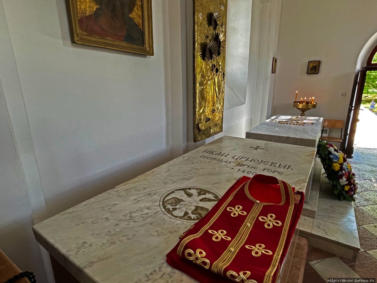Небольшая часовня в Цетине- усыпальница черногорских королей. Там же похоронен и Иван Черноевич, господар средневекового сербского княжества Зета, ставшего позже Черногорией. Памятник этому князю, основавшему Цетине в 1482 году встретил нас на входе на центральную площадь города.