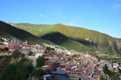 Прогулялись по монастырской деревне — очень аутентичная. Зашли в храм символизирующий Чистую Страну Гуру Ринпоче – Зангток Палри (Медноцветная Гора). Сверху посмотрели на Танцы Лам возле главной гомпы, вернее на репетицию Танцев, как нам показалось. Заселились в отель в 3-х местный номер за 150 юаней. Купили вина и фруктов. Очень хочется кофе.