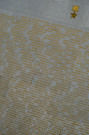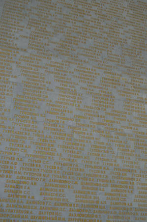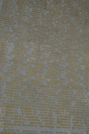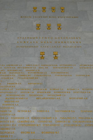 На беломраморных пилонах золотом высечены имена около 12 тысяч Героев Советского Союза и 201 Героя Социалистического Труда, удостоенных этих званий за подвиги, совершенные в годы войны. Венчают зал макет ордена «Победа» и фриз, выполненный в технике смальтовой мозаики.