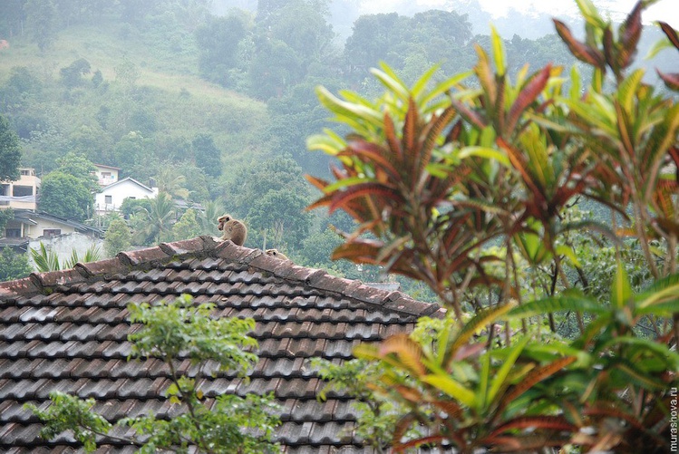 Утром проснулись с настороженностью: а сможем ли мы ходить? Вроде можем, только походка слегка как у кавалериста. Вроде уже 8 утра, солнце должно быть высоко, но его нет. Свет рассеянный и какой-то тусклый. Выглянули на улицу: ну вот, дождь идет… Облака закрывают почти весь соседний холм, на котором стоят главные ретрансляторы Шри-Ланки. Дождь то усиливается, то стихает. Туманно. Сыро. Тихо. Ну вот, теперь настоящая Англия, говорю я улыбчивому обитателю особняка. В дождь холодно и скучно. В доме тихо, все по углам сидят, телек смотрят. Просим завтрак. Как приятно выпить горячего чайку из большого чайника. Все-таки хороший тут чай, я на него уже подсела. Кофе даже не хочется. Опять нам накрыли в столовой с длинным деревянным столом, стульями с высокими резными спинками. Завтрак 300 рупий с человека.