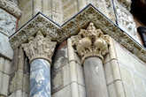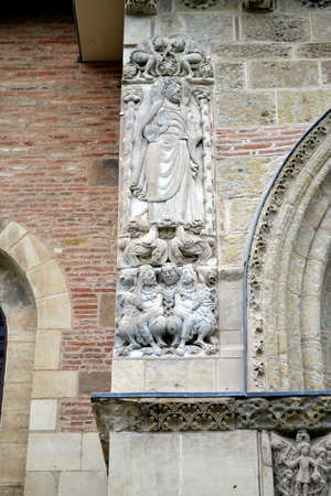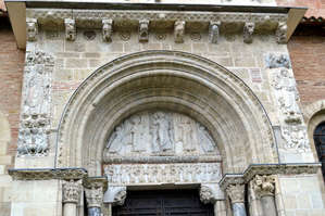На капителях колонн портала находятся рельефы на тему противопоставления порока и добродетели: многочисленные изображения грехов, разнообразных сил зла, несколько изображений богача и бедного Лазаря.
