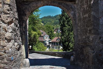 Чтобы попасть на набережную из церкви, нужно пройти через старинные замковые ворота, которые носят название Burgitor. Это единственные дошедшие до нашего времени замковые ворота. Они построены в форме арки в XIII веке. Крыша у ворот появилась лишь в 1786 году, она заменила старую надстройку с бойницами. Двери ворот были сняты в XIX веке. Ворота примыкают к старой городской стене 1280-х гг. постройки.