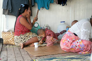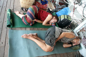 На нижней палубе парома ус троили склад тюков, узлов и коробок. А на верхней палубе расположились пассажиры — семьи со стариками, женщинами и детьми. Каждая семья расположилась на своей циновке, как в отдельном купе, только без стен. Старики спят, женщины красятся (у них это целый процесс, начинающийся с необходимости растереть в кашицу брусок мыльного дерева), дети играют в игрушки. На корме стоит дровяная печь. На ней все пассажиры по очереди готовят себе еду — на открытом огне.