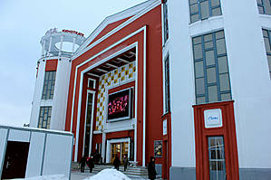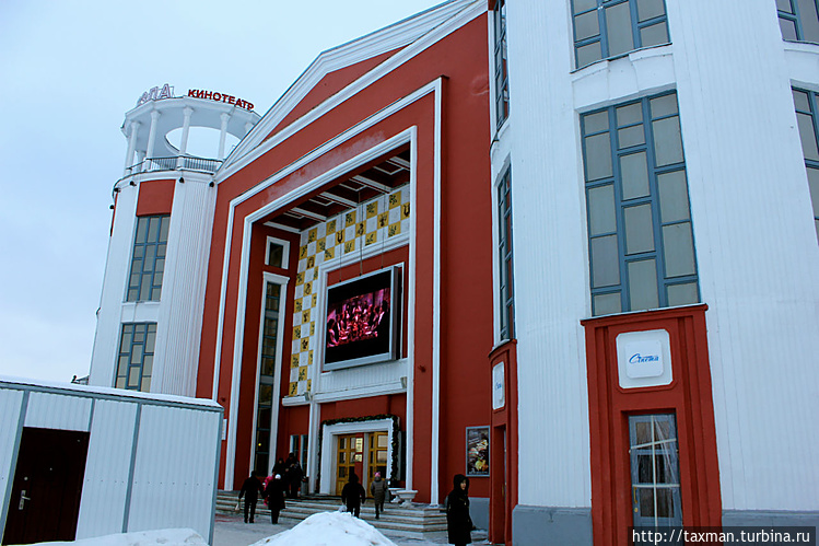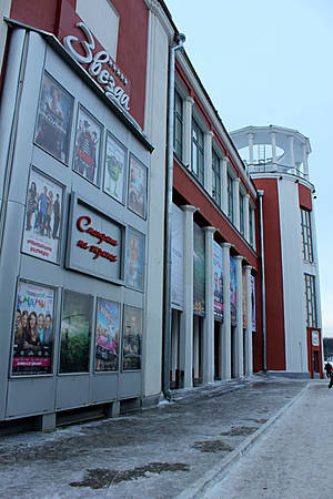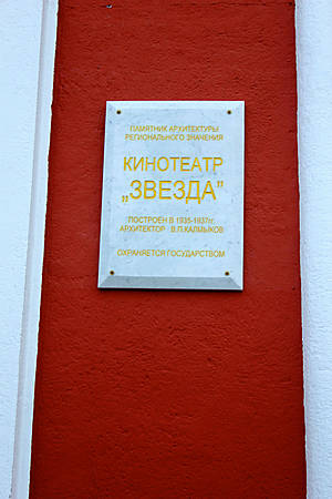 Двухзальный кинотеатр Звезда построен в 1935—1937 гг. по проекту московского архитектора В.П.Калмыкова и является интересным примером переходного стиля от конструктивизма к сталинскому неоклассицизму. Фланкируют вход две круглые крупные башни, прорезанные вытянутыми по вертикали окнами. Боковые фасады здания кинотеатра Звезда украшают высокие, в два этажа шестигранные колонны. В нишах второго этажа — ярус шестиугольных окон. Очень напоминает бинокль )))