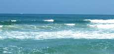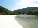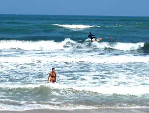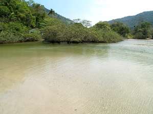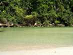 Пляж довольно большой, а волны там сильные не на всем протяжении, по обоим краям впадают небольшие реки, есть отмели и экраны из прибрежных камней. Там можно и поплавать просто так, и детей искупать. Река с правой стороны и больше и интереснее, её устье находится вплотную к ограничивающему пляж каменному склону. Вдоль реки тянутся мангровые заросли, они легко посещаемы километра на два в глубину континента, при помощи плавсредств, которые тут же и арендуют. Недешёвая тургостиница на другом берегу реки имеет также сектор кемпинга. Реку нетрудно перейти вброд, а желающих остаться сухими постояльцев перевозят на небольшом пароме с ручным приводом. Вода в реке очень прозрачная. Повсюду мелькают стайки мальков, можно встретить и осторожных крабов, приспособленных к донному образу жизни. Изгиб реки образует из правой стороны пляжа довольно просторную и плоскую косу, приглашающую к подвижным играм на песке.