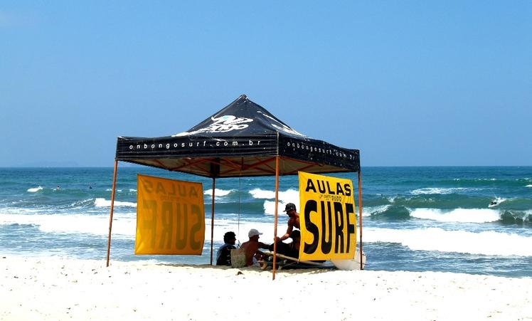 Любой посетитель может заехать в этот посёлок на автомобиле и бесплатно запарковаться на одной из таких улиц. Причём, здесь ему не будут досаждать какие-то мутные личности, с предложениями посторожить машину за деньги, как на многих более доступных пляжах. Охраной посёлка занимается профессиональная команда и подобную публику быстро вычищают. Да и добираться ей сюда не особо удобно. Политика кооператива по отношению к сфере услуг на самом пляже такова, что там разрешены всего 3 фиксированных закусочных, владельцы которых платят солидный сбор за аренду аккуратных зелёных павильонов с черепичной крышей (один из них виден в глубине, в левой части снимка). Этим обеспечивается относительно высокий уровень цен и качества, а интенсивность спроса регулируется в нижнюю сторону. Кроме них, в дни организованного сёрфинга ставят ещё и палатку по продаже энергетического коктейля из асаи. Передовые посты от павильонов питания иногда перемещаются по пляжу с тележками мороженого. И только лишь. В остальном, сфера услуг представлена исключительно арендой спортинвентаря и первоначальным обучением его пользователей. Никакая деятельность по сдаче в аренду стульев, зонтов и прочего не приветствуется.