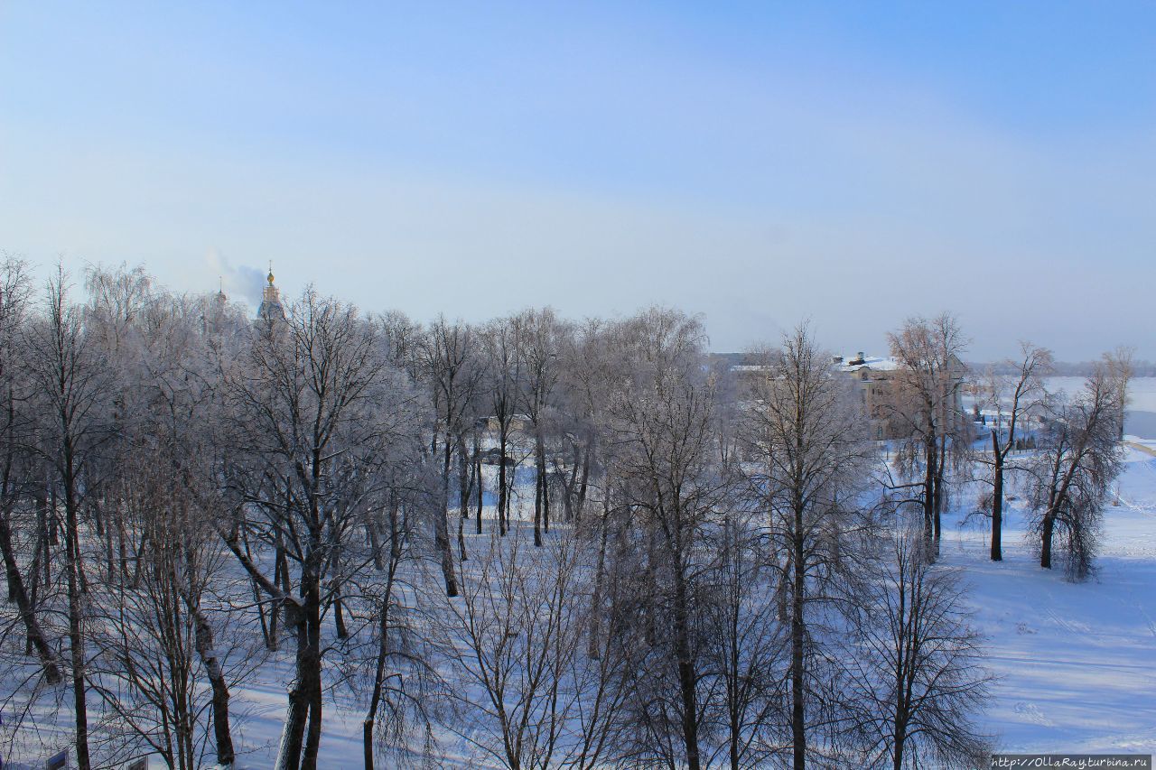Гостиница ... просто гостиница.Честно говоря, мы были уверены, что как стемнеет, то делать тут будет нечего, так и останется что сходить поужинать, да перед телевизором зависнуть. И это тоже неплохо, особенно если встал рано, да целый день на морозе провёл. Но оказалось, что город душевно подсвечен — так и тянуло пройтись после ресторана, что мы и сделали. Конечно, при солнечной погоде нужно посмотреть на закат. Жёлтые волжские закаты только что по зиме и приобретают красноватые оттенки. В кремле, кстати, подсветка тоже есть. И поскольку людей об это время немного, то можно спокойно осмотреть фрески. Историческая справка: здание было построено в начале 19 века для присутственных мест. Здесь располагалась Городская дума и другие учреждения. Интересно, что строение имеет два идентичных фасада — один обращён в кремль, а второй к городской площади. Угличский кремль — то место, которое вы не минуете, ну или не должны миновать, если хоть на полчаса заехали в этот город! Некогда здесь были валы и стены, которые обновляли последний раз в 17 веке. А после разобрали вовсе за ненадобностью и ветхостью. Сейчас тут сохранилось несколько построек и остатки рва. Периметр кремля небольшой, но очень живописный. За что люблю зиму, так это за то как мороз инкрустирует ветви деревьев! И в этом смысле нам в тот день повезло. С западной оконечности кремля открывается вид на Казанскую церковь. Историческая справка: Церковь Казанской иконы Божией Матери в стиле барокко была построена в конце 18 века на месте более старого храма. Она располагалась на большой торговой площади и содержалась на средства купцов и торговых рядов. Сильно пострадала от пожара, который напрочь уничтожил торг. Но была восстановлена. В времена строительства ГЭС использовалась как водонапорная башня, склад и общежитие. Ныне церковь возвращена верующим, действует. Около неё выстроена большая детская площадь. Архитектурным центром кремля безусловно является Спасо — Преображенский собор с колокольней. На колокольню можно подниматься круглый год. Не сказала бы, что оттуда открываются масштабные виды, но сам процесс интересен, да и поглядеть на окрестности с высоты забавно. На площадке безопасно — высокие ограждения. А ещё ты находишься на уровне верхушек деревьев — было занятно смотреть на нахохлившихся от мороза птиц. Видны и купола собора. В собор рекомендую зайти — он очень атмосферный. Помнится, когда-то даже слушала здесь выступление одного из прославленных российских церковных хоров (но такое случается чаще во время фестивалей или в высокий сезон, когда в городе много туристических групп). Историческая справка: Собор Спаса Преображения — кафедральный собор Углича. Построен в самом начале 18 века. Является самым крупным строением кремля. Высота центрального периметра — 14 метров. Стены расписаны крепостными мастерами из Владимирской губернии. Колокольню возвели спустя 15 лет. На колокольне находятся часы с боем, которые, являясь музейным экспонатом, действуют и сейчас. Снабжены ныне электронным механизмом. Под солнцем собор отбрасывал тень на белую ровную гладь заснеженной Волги. И мне показалось это столь живописным, что я попыталась заснять. Получилось не очень впечатляюще. Интереснее вышло в своё время у mikeseryakov . А мы отправились в палаты угличских князей. Сейчас здесь находит
