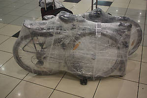 Летели мы из Внуково. До аэропорта добрались "Аэроэкспрессом" — по 320 руб. за нас и по 50 руб. за велосипед. Складывали непосредственно в аэропорту. Я открутил педали, переднее колесо и руль (тросики все, кроме переднего тормоза оставил как есть). Скотчем я приклеил колесо и руль к раме и понес вел к запаковщику в пленку. Сначала мужики сказали, что ничего не получится, потом уломал их все-таки. Кое-как запаковали. Сказали заплатить как за 3 места (750 руб.) — типо негабарит. Оказалось, что в положенные для велосипеда 220 см по трем измерениям не укладываемся — получалось где-то 240-245 см.