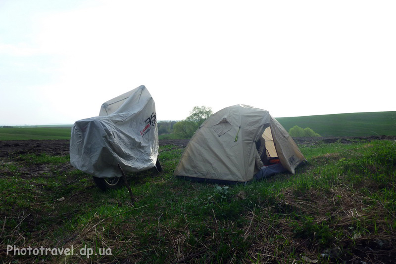 Смотрим — пора бы заправиться. Тут и заправка под боком подвернулась. Что-то из сети авиаса, бензин до неприличия дешевый, но это почему то не настораживает, а радует. А ведь зря не насторожило — километров через 25-30 мотоцикл начинает глохнуть. Останавливаемся осматриваем все — вроде все в порядке, заводим едем дальше и опять 10-15 км. и глохнет. Начинаем грешить на плохой бензин. Пробуем передвигаться за фурами с небольшой 40-50 км/ч скоростью. Едет — все нормально, только разгоняемся до 60 км/ч и опять все повторяется. Надежда говорит, что проблема только в бензине и что выкатав его пусть и на малой скорости все в дальнейшем будет отлично, ведь у нас еще две недели покатушек. Решаем остановиться на ночевку, недоезжая до Александрии на каком-то съезде в лесочке ставим палатку, ужинаем и спать. Утро вечера мудренее.