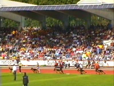 Иллюзии о возможности попадания Арчера в первые ринги после проверки поведения и описания у нас с Ириной развеялись ещё в первые годы участия в Зигере. Теперь мы уже твёрдо знали, что попасть в первую сотню кобелей рабочего класса мы не можем в принципе. Но, тем не менее, каждый раз надеешься на чудо. Поэтому по дороге в Ульм и уже на стадионе в процессе наблюдения за конкурсом племенных групп мы втайне надеялись, что Арчеру удастся прорваться в рейтинговом листе на окончательную расстановку повыше, чем в предыдущий год. В Бремене у нас была 114-ая позиция, а в Карлсруэ – 131-ая.