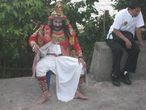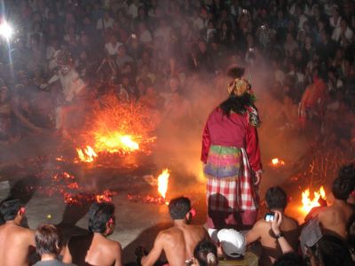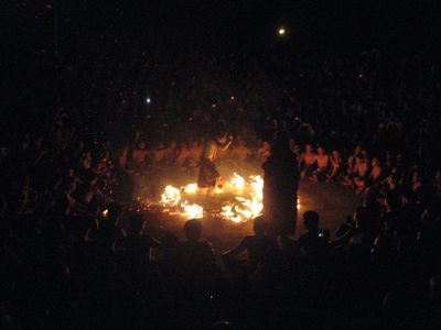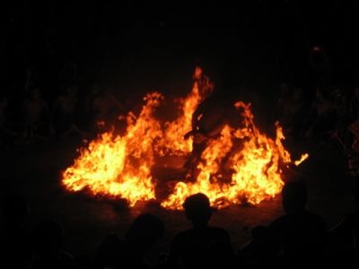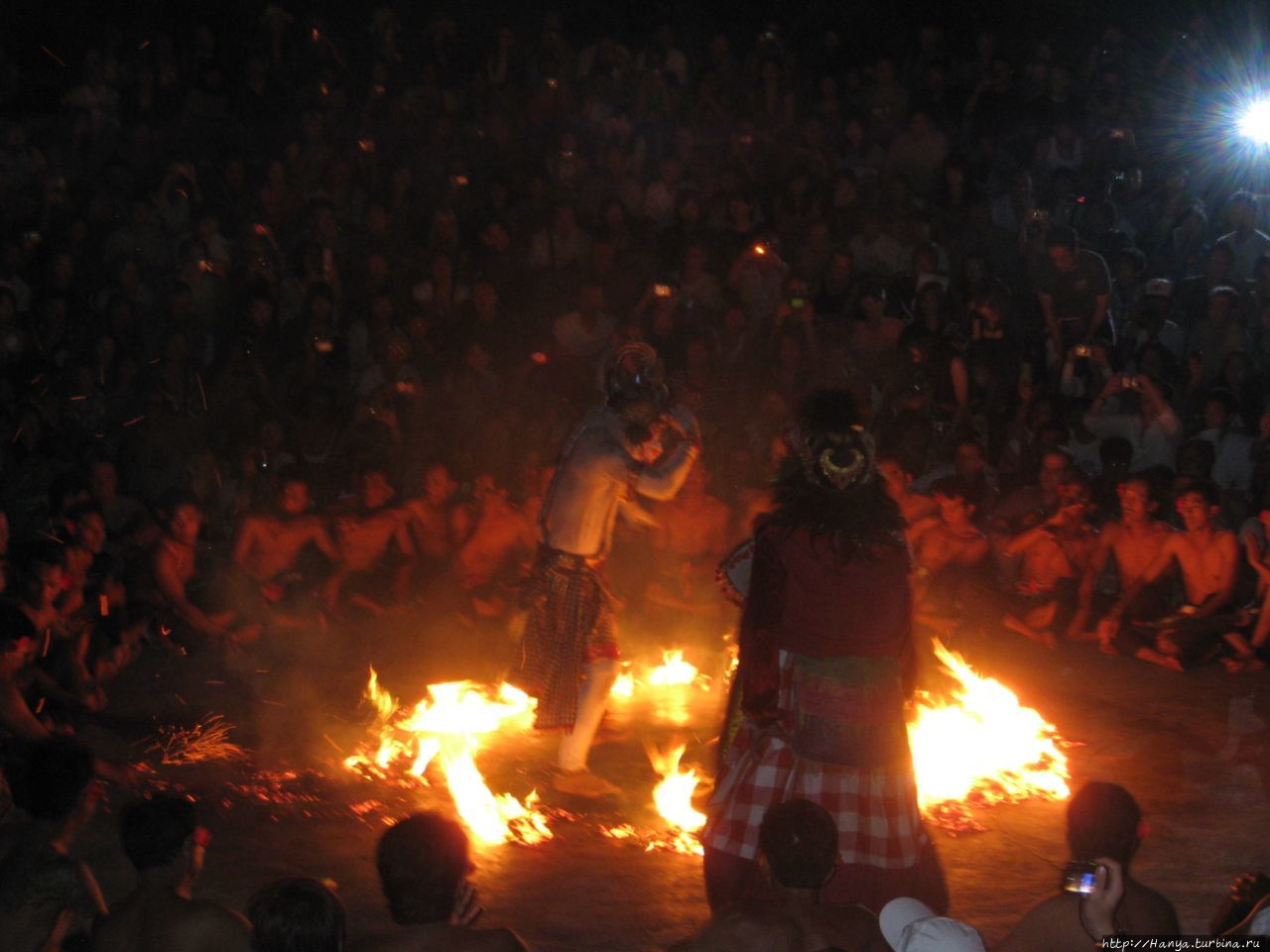 Нестерпимо горит лицо и спина, и через какое-то время мы теряем интерес к представлению. Все же одного танца было бы вполне достаточно! Конец очень красочен: разводится костер по очерченному кругу, один из героев прыгает и голыми ногами тушит его.
