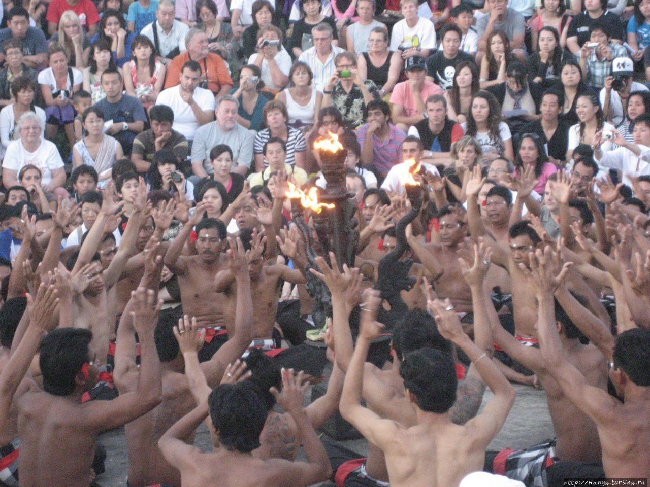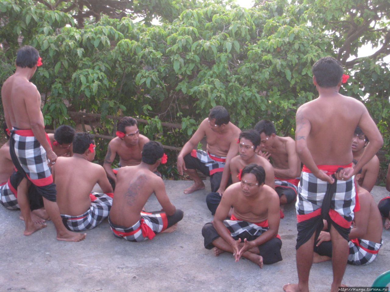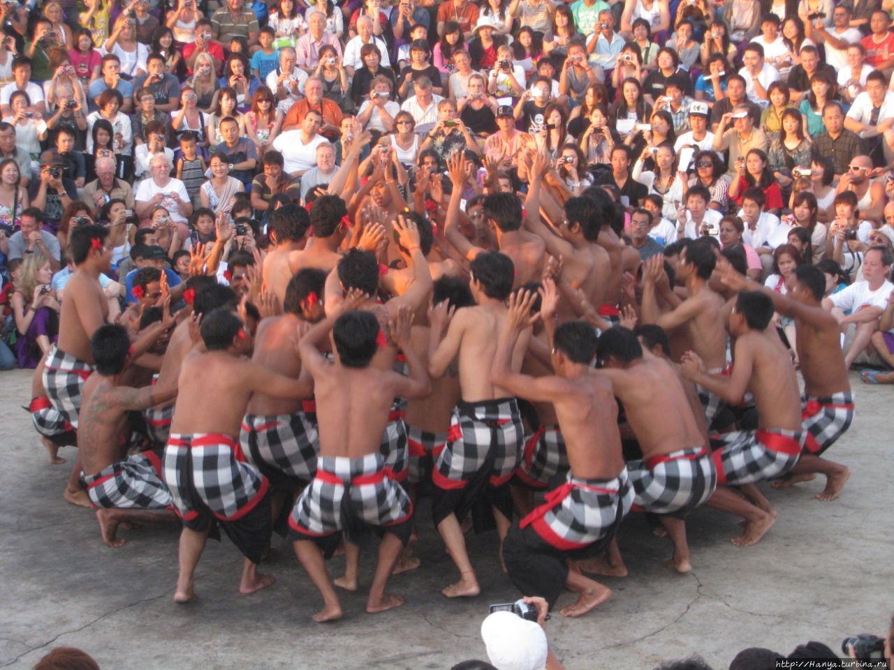 Потихоньку мы включаемся в сюжетную линию захватывающего танца и с удивлением отмечаем, что собственно, музыки-то и нет, участники оркестра извлекают звуки не из инструментов, а из собственных ртов. Здорово! Изысканные танцевальные движения в лучах заходящего солнца буквально завораживают, ощущаешь, как танцор входит в состояние транса. В отличие от танца Баронг, здесь не используются маски, и несмотря на то, что танец искусственно создан, а не рожден традициями, сегодня он стал иконой художественных традиций танца на Бали.