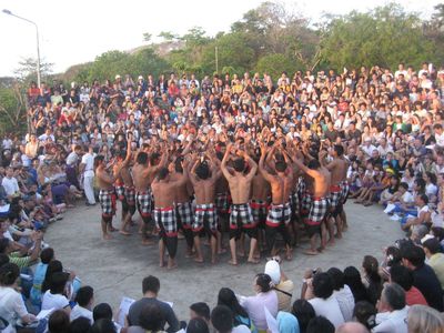«Это один из самых известных и популярных танцев на острове Бали, несмотря на то, что вошел в традицию меньше ста лет назад. Танец был придуман и поставлен в 1931 г. Уолтером Спайсом и Катрин Мершон для немецкой кинокартины «Остров демонов». В основе сюжета история из индийского эпоса Рамаяна. Король Rama с женой Dewi Sita проводит 14 лет в изгнании в лесной глуши. Они подвергаются преследованию злого короля-великана Rahwana. Rahwana выкрадывает королеву, но Rama, заручившись помощью королевства обезьян, побеждает его и освобождает супругу. Труппы kecak очень многочисленны, так как кроме основных персонажей, на сцене появляется еще около сотни актеров, изображающих обезьян».