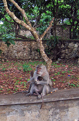 Дальше же, во время прогулки по крутому берегу Улувату и наслаждения от чудных панорамных видов на морской прибой, ласкающий вертикальные скалы, нужно обязательно держать ухо в остро. Рядом с нами множество обезьян, и некоторые весьма агрессивны. Конечно, они не нападают на людей с целью нанесения травмы, они просто при любой возможности попытаются у вас что-нибудь украсть — очки с лица, или цепочку с шеи. "Осторожно, здесь обезьяны!"