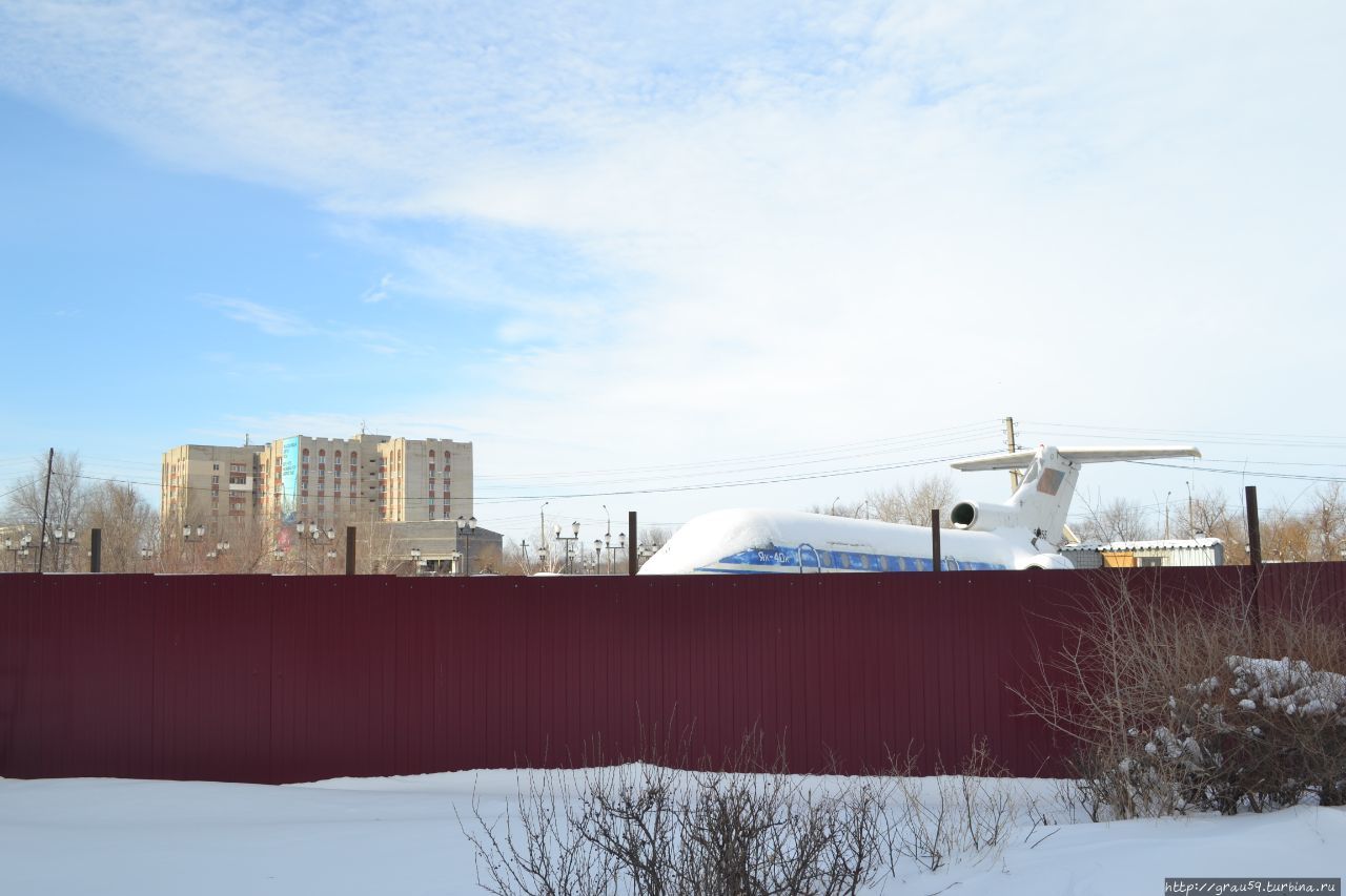 Бежал я по своим делам по Уральску в феврале 2018 года и увидел за забором... Похоже самолёт. Нашёл место повыше, поглядел — точно самолёт "Як-40".