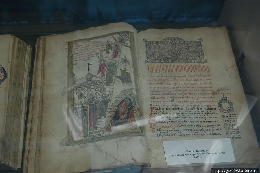 Удивительно выглядит с тщательно вырисованными буквами книга "Лествица" , напечатанная в 1647 году при царе Алексее Михайловиче.