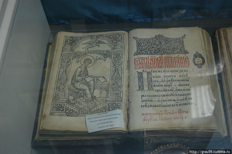 Рядом с ней лежит Евангелие ,напечатанное в марте 1627 года еще до раскола церкви. Книга издана в г.Москве при царе Михаиле Федоровиче .