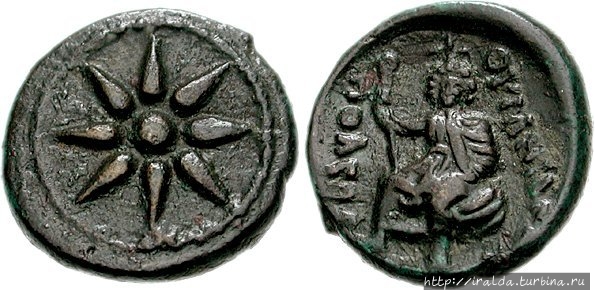 Ещё есть интересная отличительная особенность города. На найденных античных монетах Уранополиса изображены сидящая на шаре Афродита Урания с надписью «Ouranio Poleos», что переводится как «небесный город», и сияющее восемью лучами солнце на противоположном обороте. (фотография из Интернета)