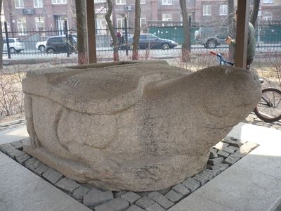 Скульптура черепахи устанавливалась на родовом кладбище, рядом с местом погребения члена императорского рода Ваньянь. Во время раскопок было обнаружено две черепахи, одна находится в Парке, другая в Хабаровском музее.