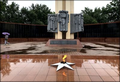 Это единственный город за две недели, где нас застал дождь, поэтому много осмотреть здесь не успели. На фото — мемориал с Вечным огнём, посвящён жителям города, не вернувшимся с фронтов Великой Отечественной войны.