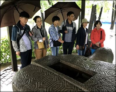 На фото фрагмент черепахи и туристы из Южной Кореи.