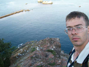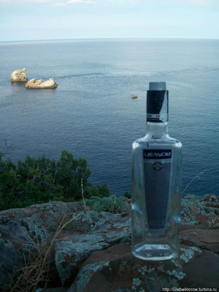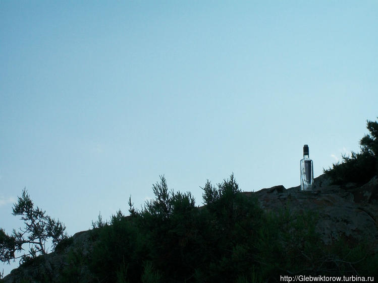 На мысу была найдена пустая бутылка водки, пофоткал ее с разных сторон на фоне Медведь-горы