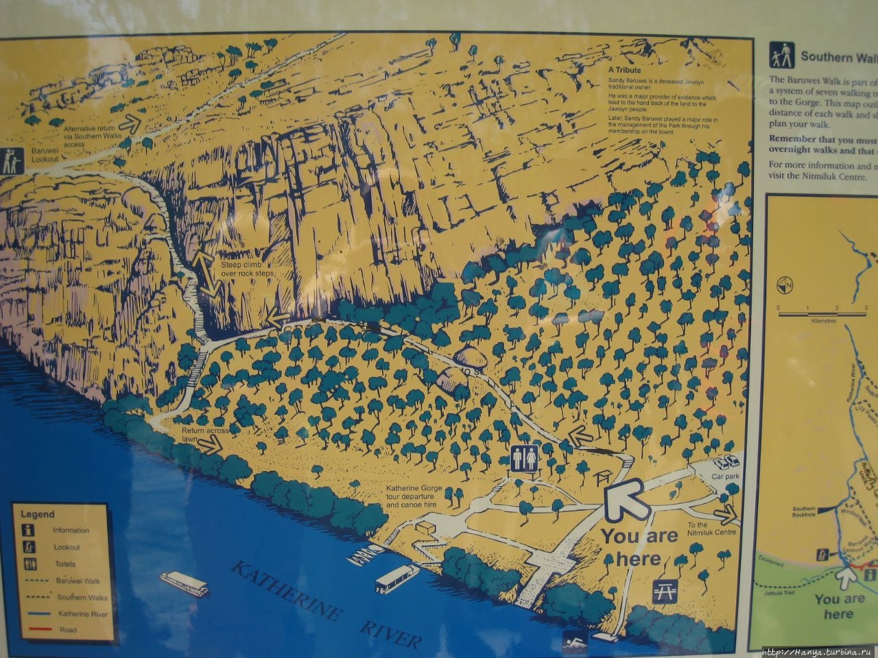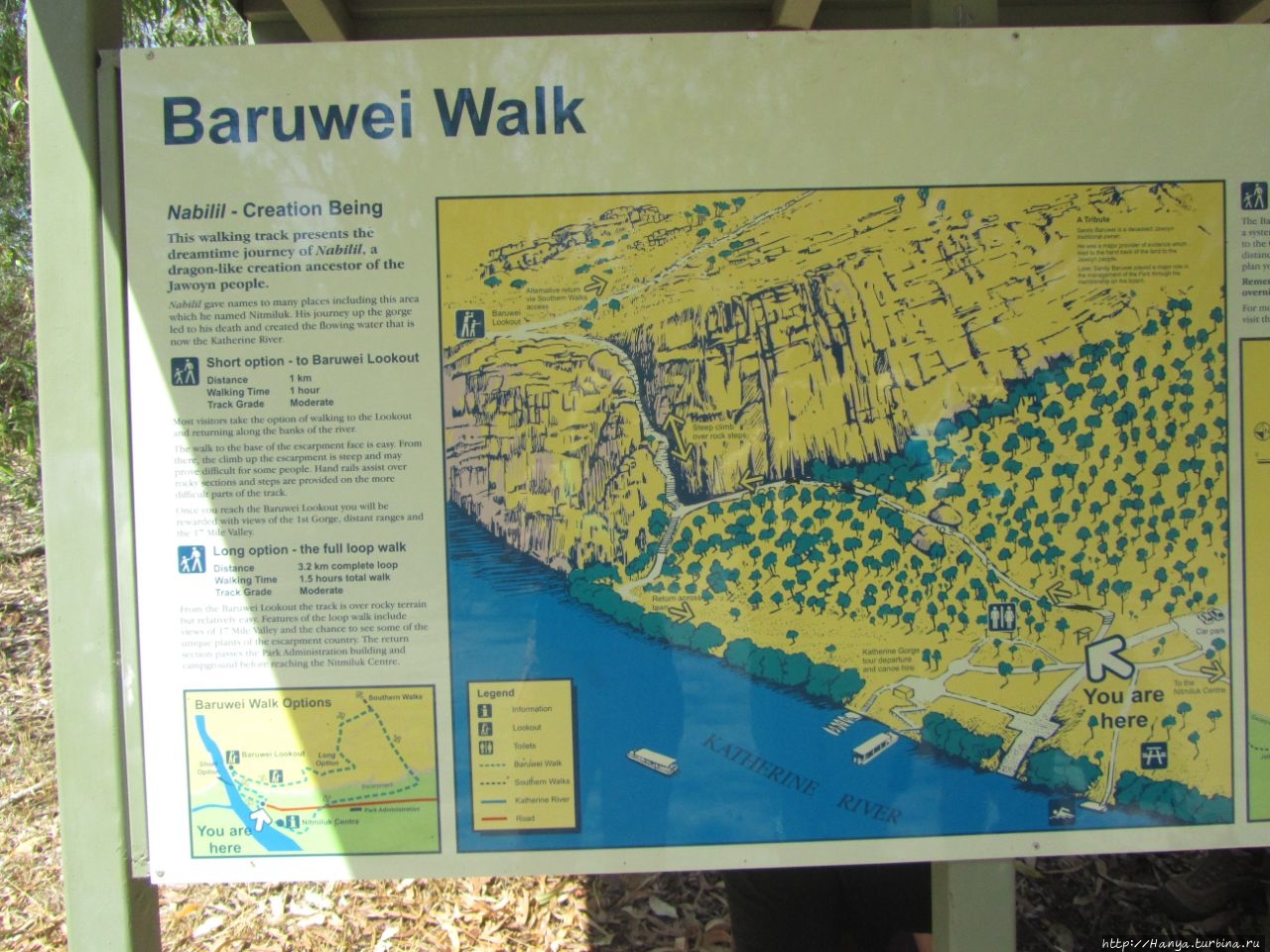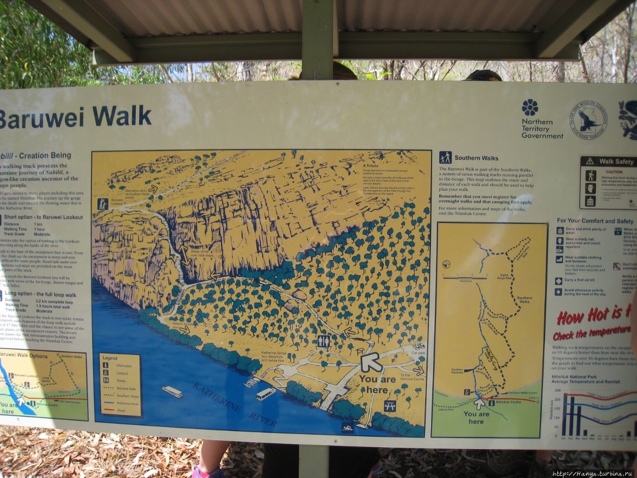 Очень скупо Росс информирует нас, что район Кэтрин — рай для любителей пеших прогулок. Вообще-то в этом регионе есть шесть национальных парков и множество других заповедников. Только через национальный парк Нитмилук проходит более 100 км пешеходных маршрутов!