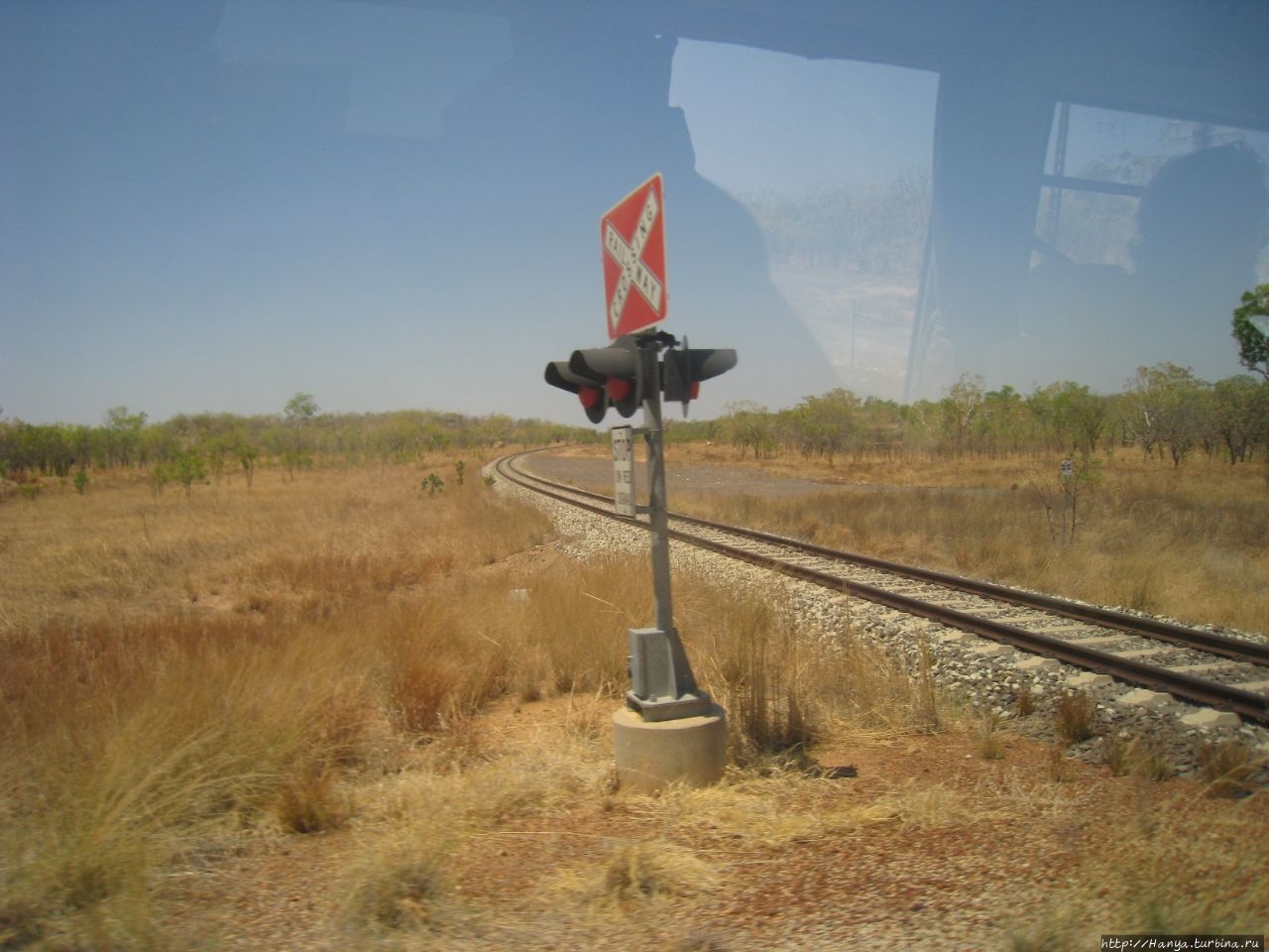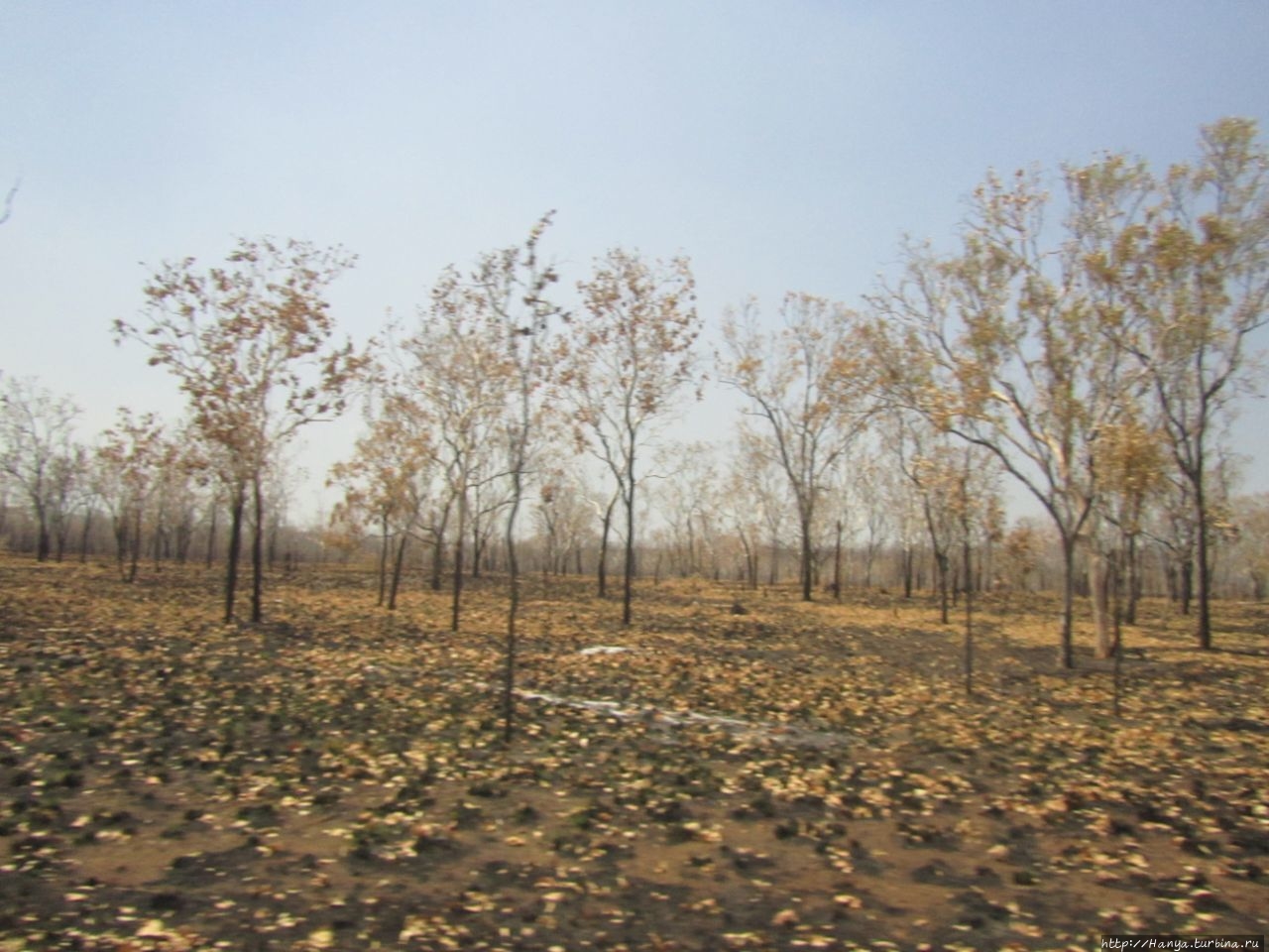 Нацпарк Нитмилук, водопад Эдит и новый гид. Ч.32), мы столько же времени (60 км) едем к другому сайту. По бокам дороги нас уныло приветствуют то ли сухие деревья, то ли сгоревшие. Пересекаем железнодорожные пути, и в голове промелькивает мысль о путешествии в поезде.