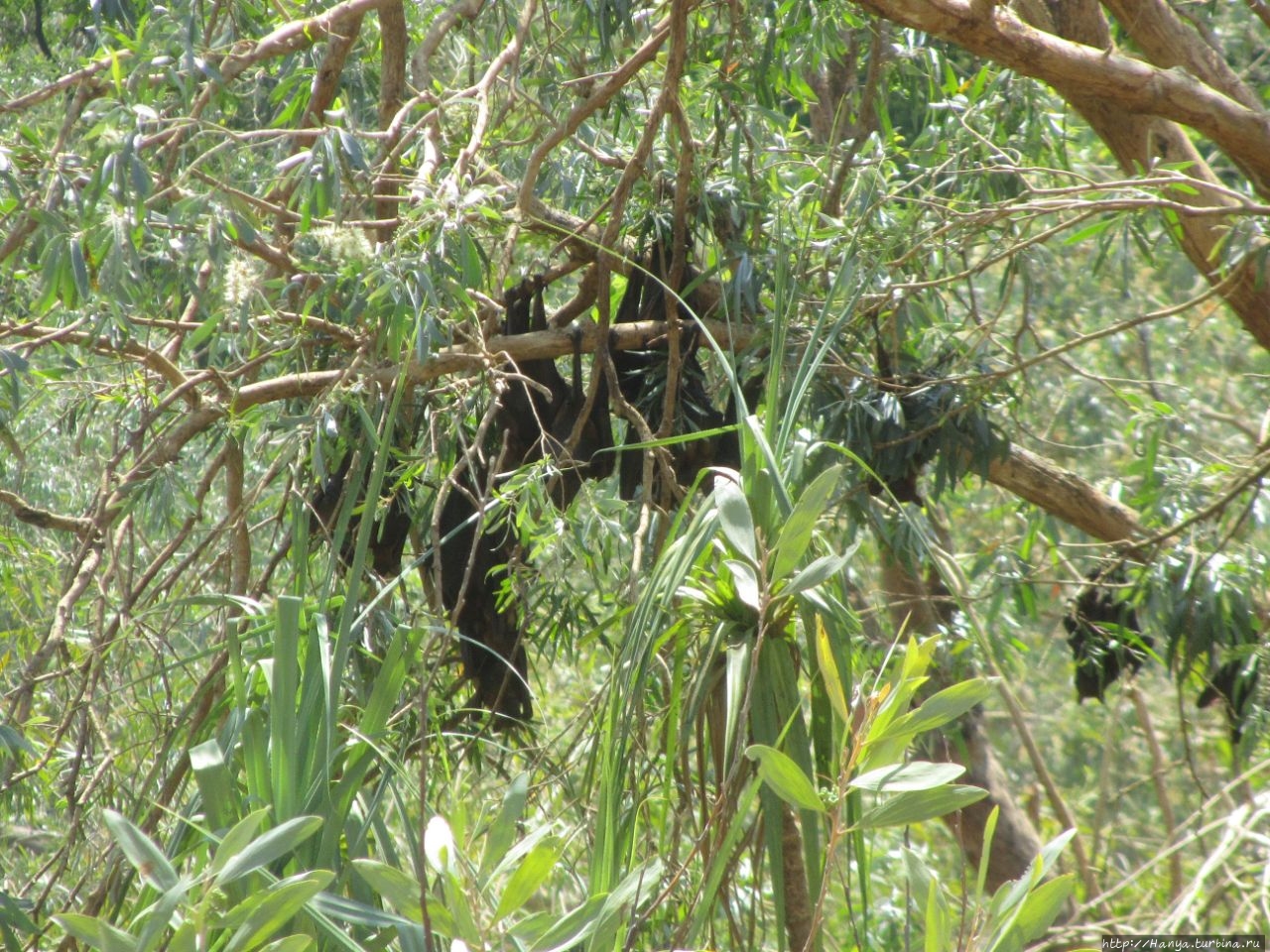 Оставив машину на стоянке, мы выдвигаемся в путь. По дороге к стоянке Росс обращает наше внимание на летучих мышей, которые буквально облепили деревья, вися вниз головой. Сейчас они отдыхают, и мы глядим на них через видоискатель. В Индонезии мы уже знакомились с этими особями, но здесь, в Австралии, они огромны, достигают веса в 1 кг и имеют размах крыльев до 1,5 метров.