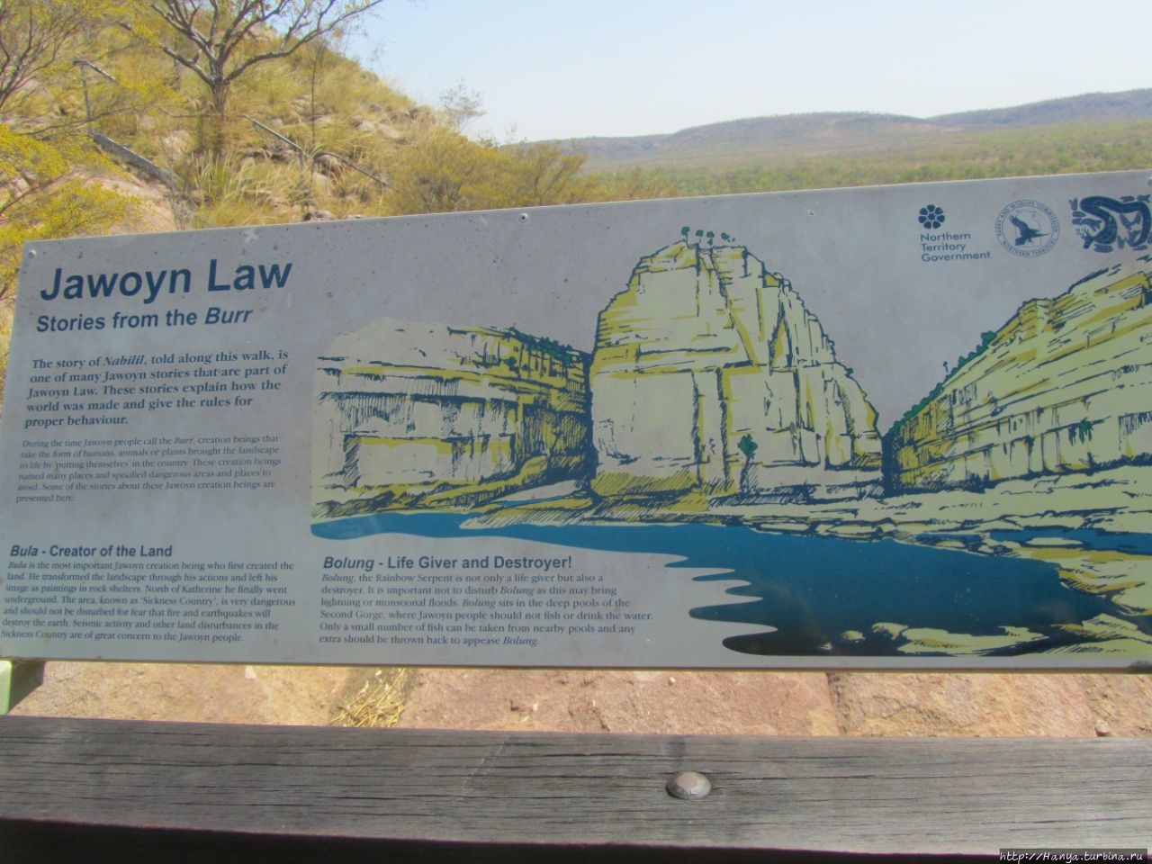Пока Росс оплачивает входные билеты, удается что-то прочитать, и мы узнаем, что предком и создателем в племени явойн считается драконообразная сущность Набилил – Nabilil. Поднявшись наверх ущелья ценой своей жизни, он создал реку Кэтрин. Далее следуют традиционные предупреждения о безопасности, настораживает лишь необходимость взять с собой уже 3 (три!) литра воды. Что же нас ждет впереди? И опять, хорошо, что я этого не знала, а то бы могла не пойти.