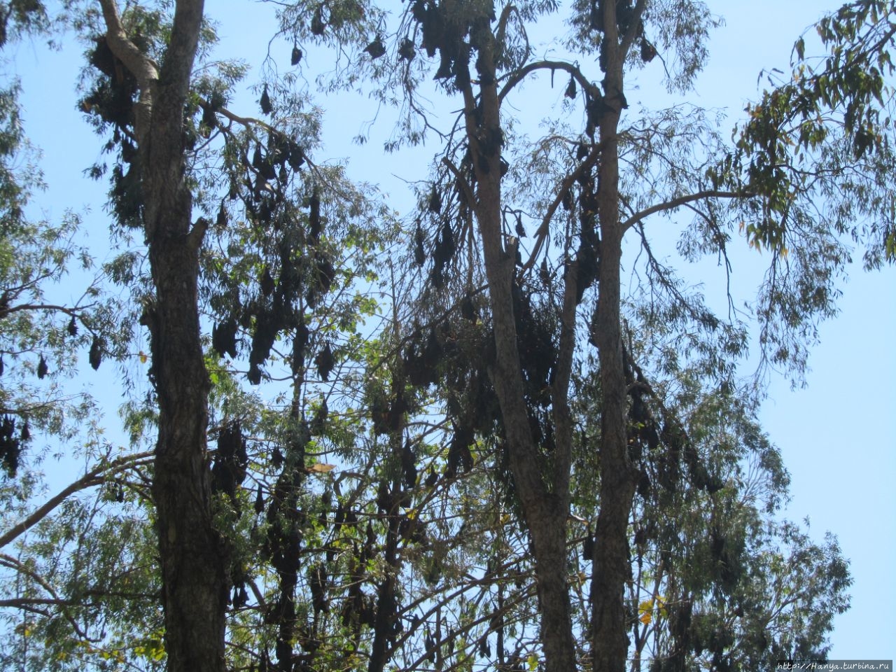 Возвращаясь обратно, снова поднимаем голову вслед за всеми туристами, и видим, что деревья буквально облеплены висящими вниз головой летучими лисицами.