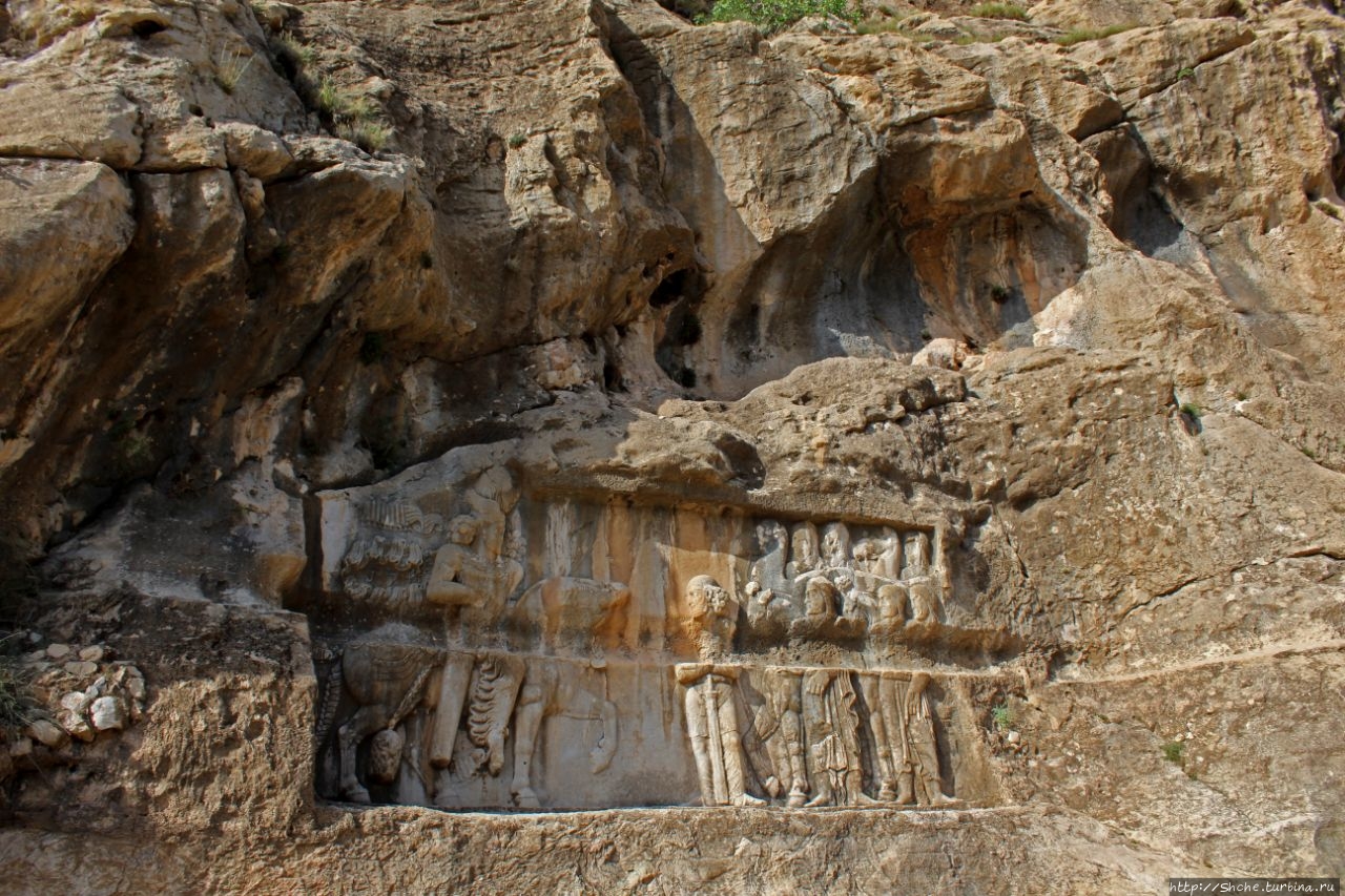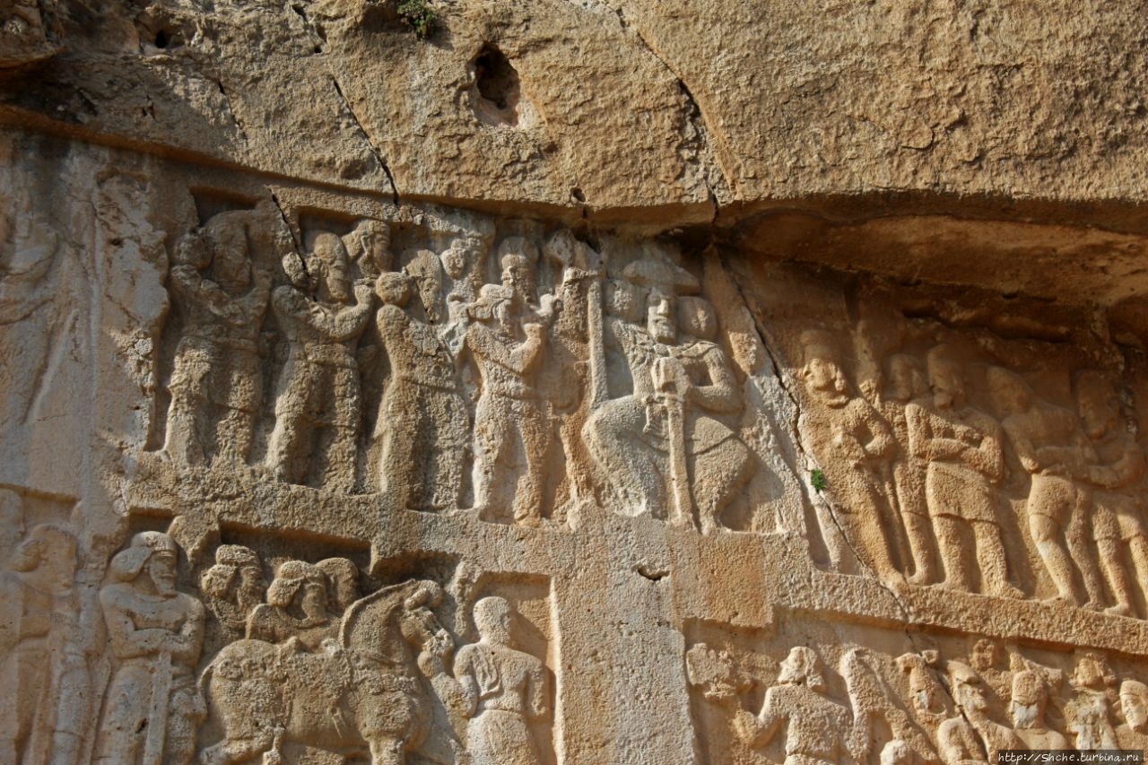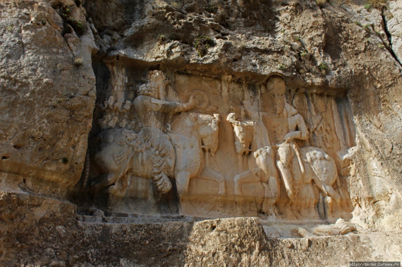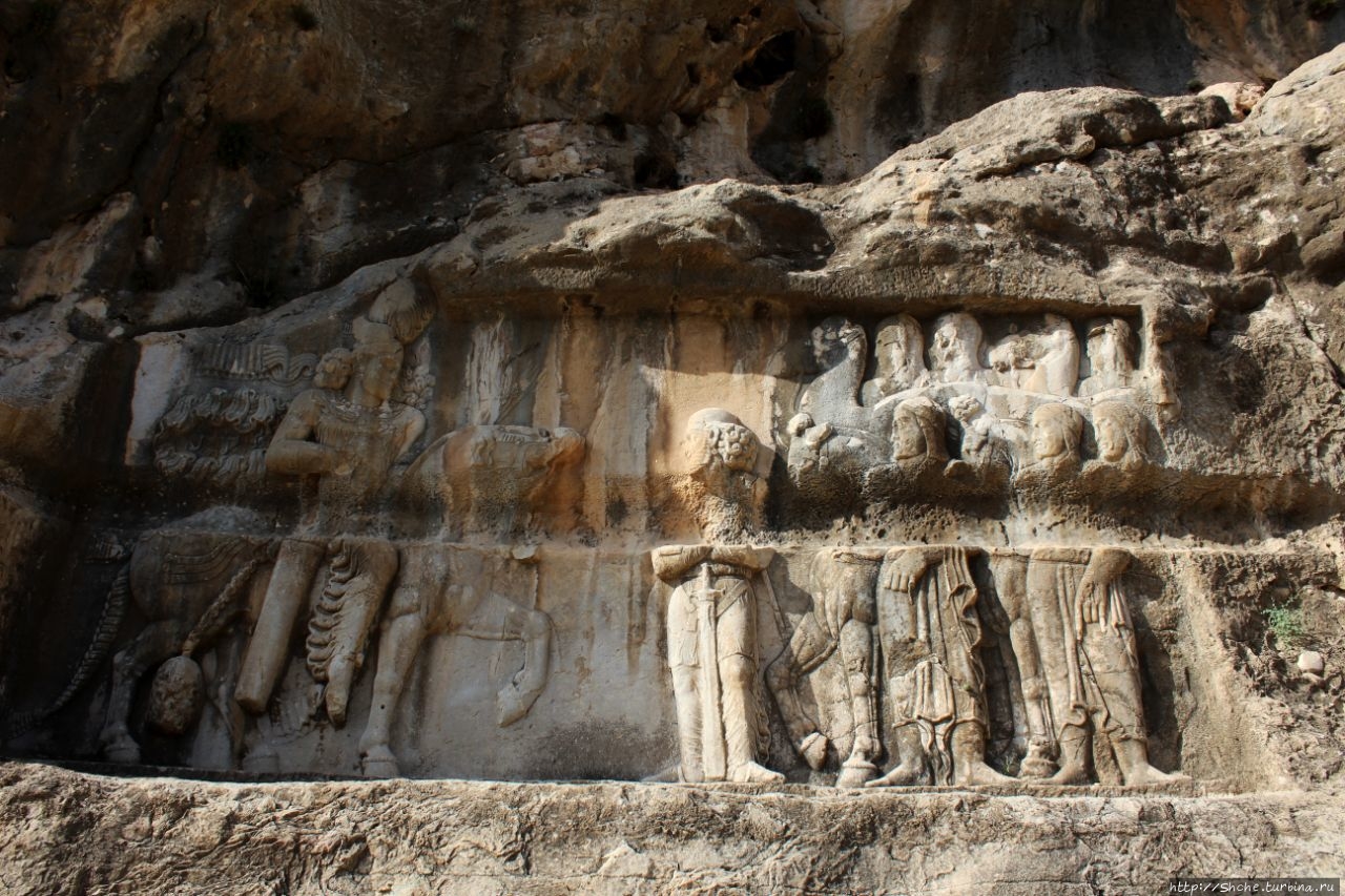 Барельеф изображает славную победу Шапура I против трех римских императоров; Корпуса Гордиана III (238–244) (он под ногами его лошади), плененного Валериана (253–260), и Филиппа Арабского (244–249), стоящего на коленях и просящего мира и вернуть тело покойного молодого императора. (эта сцена в нижнем левом углу снимка).