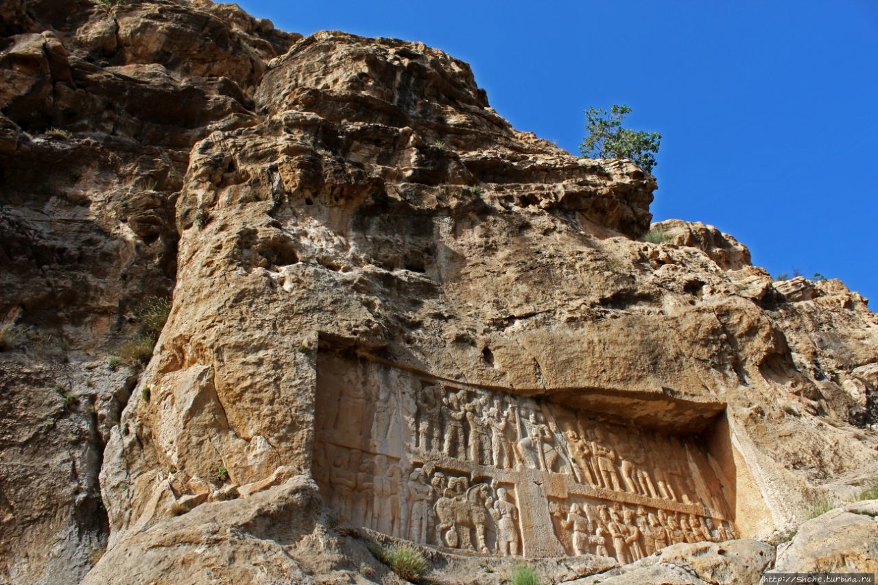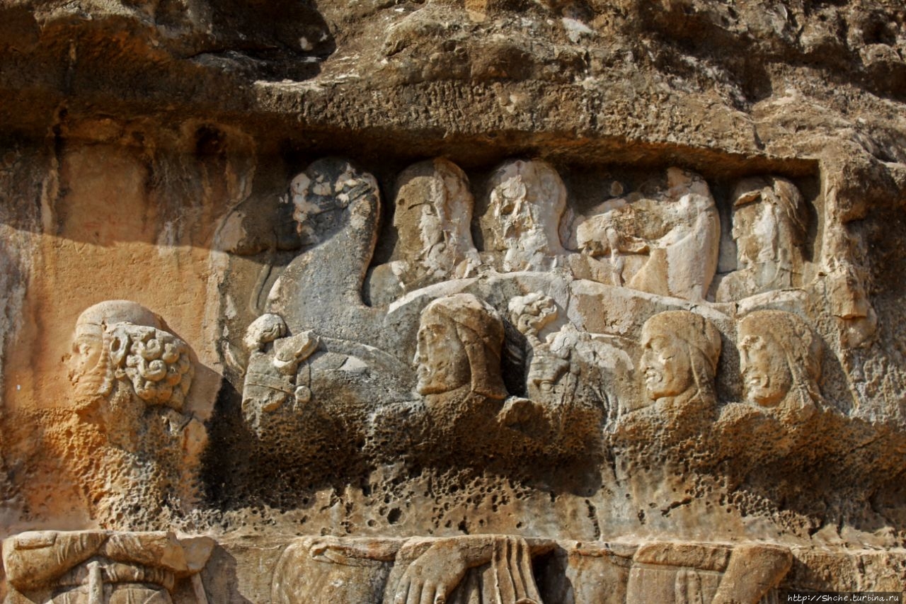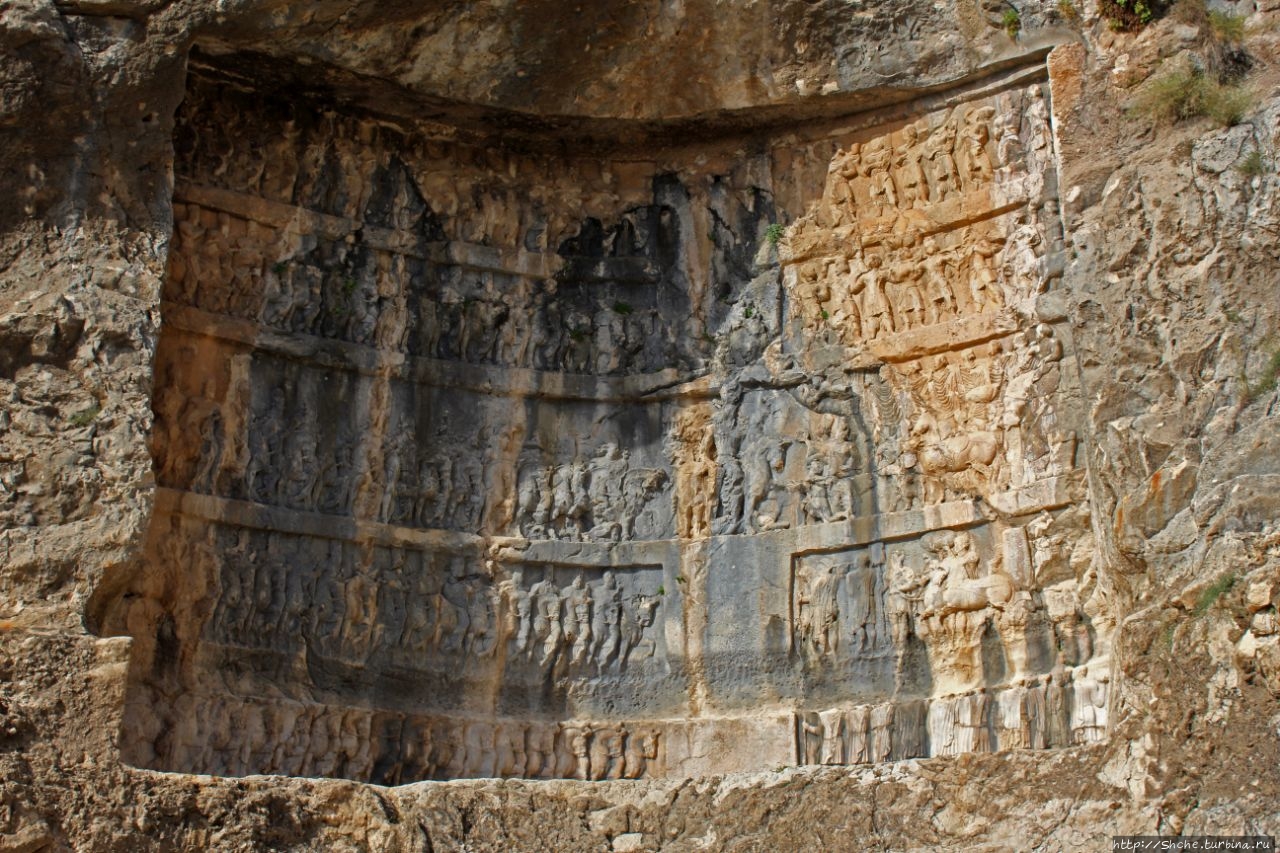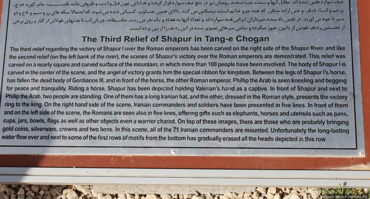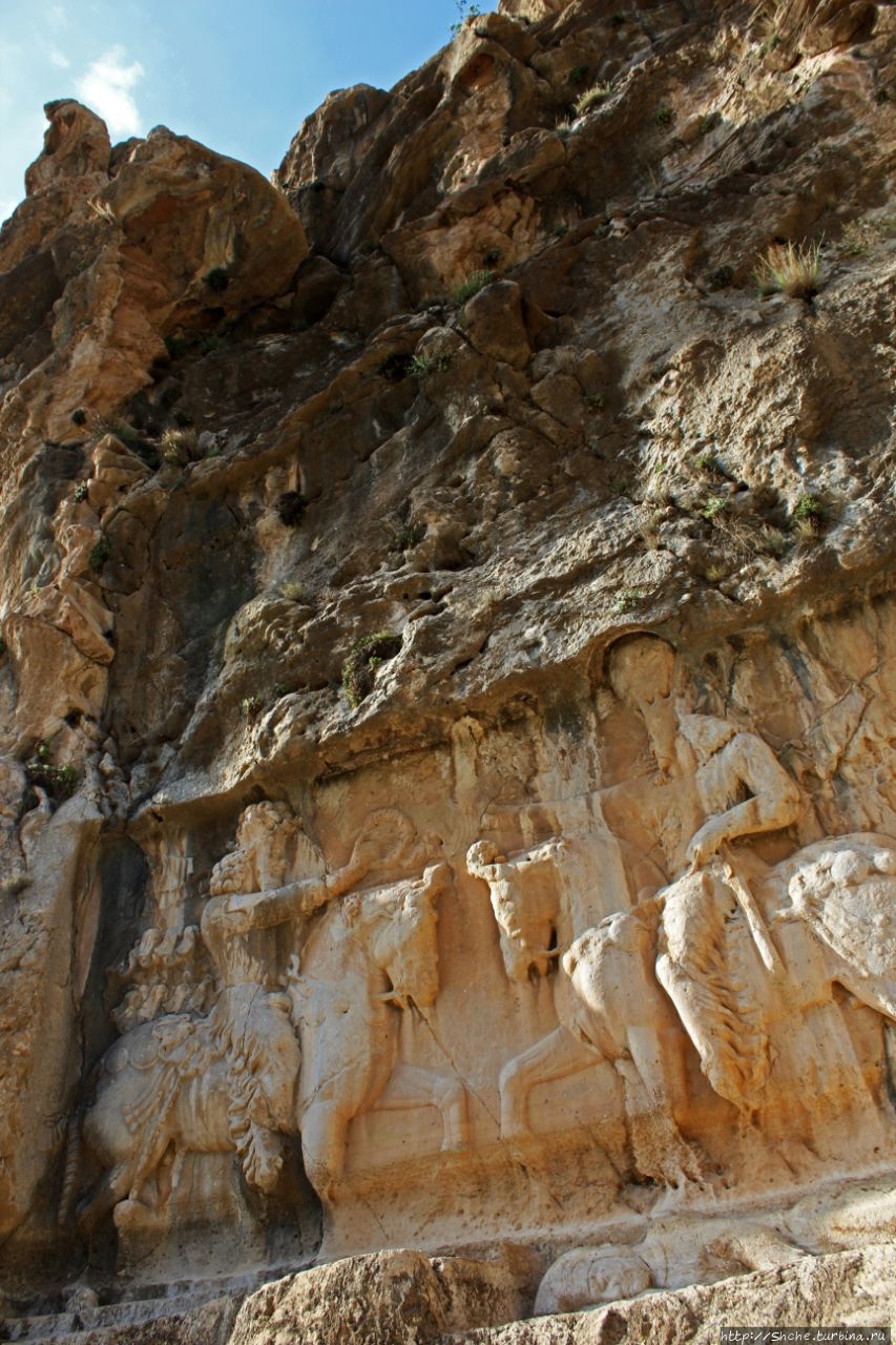 Барельеф изображает славную победу Шапура I против трех римских императоров; Корпуса Гордиана III (238–244) (он под ногами его лошади), плененного Валериана (253–260), и Филиппа Арабского (244–249), стоящего на коленях и просящего мира и вернуть тело покойного молодого императора. (эта сцена в нижнем левом углу снимка).
