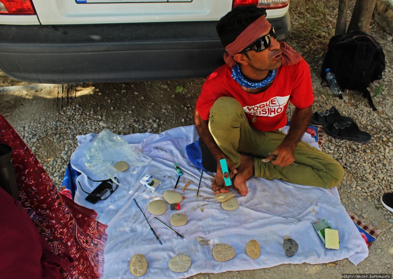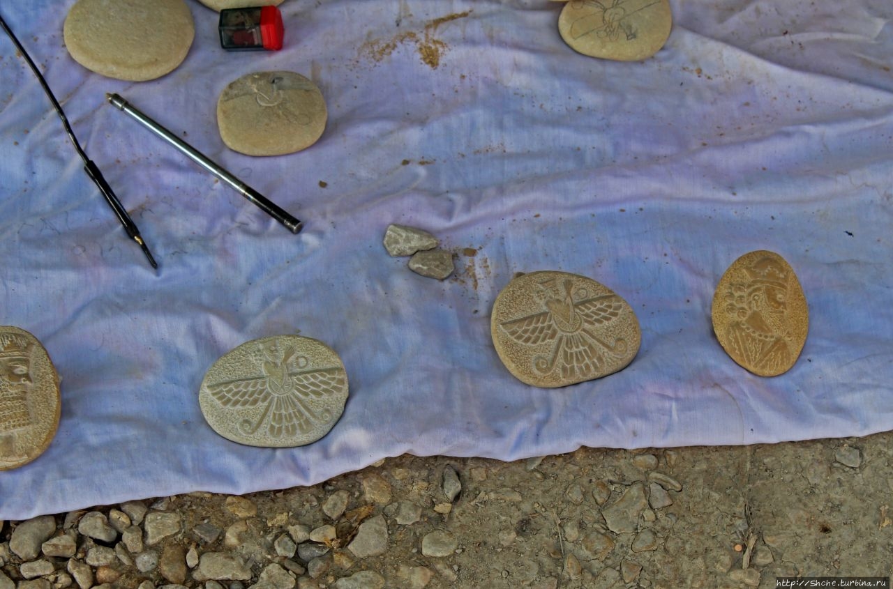 В тот день мы совершали довольно длинный переезд из Ахваза, и приехали на стоянку возле древнего Бишапура уже ближе к вечеру. Место не часто, но посещаемое туристами, потому прямо на парковке мы увидели одного местного умельца, изготавливающего незамыстловатые, но симпатичные сувениры из камня с изображением персидской символики и потретами древних правителей.