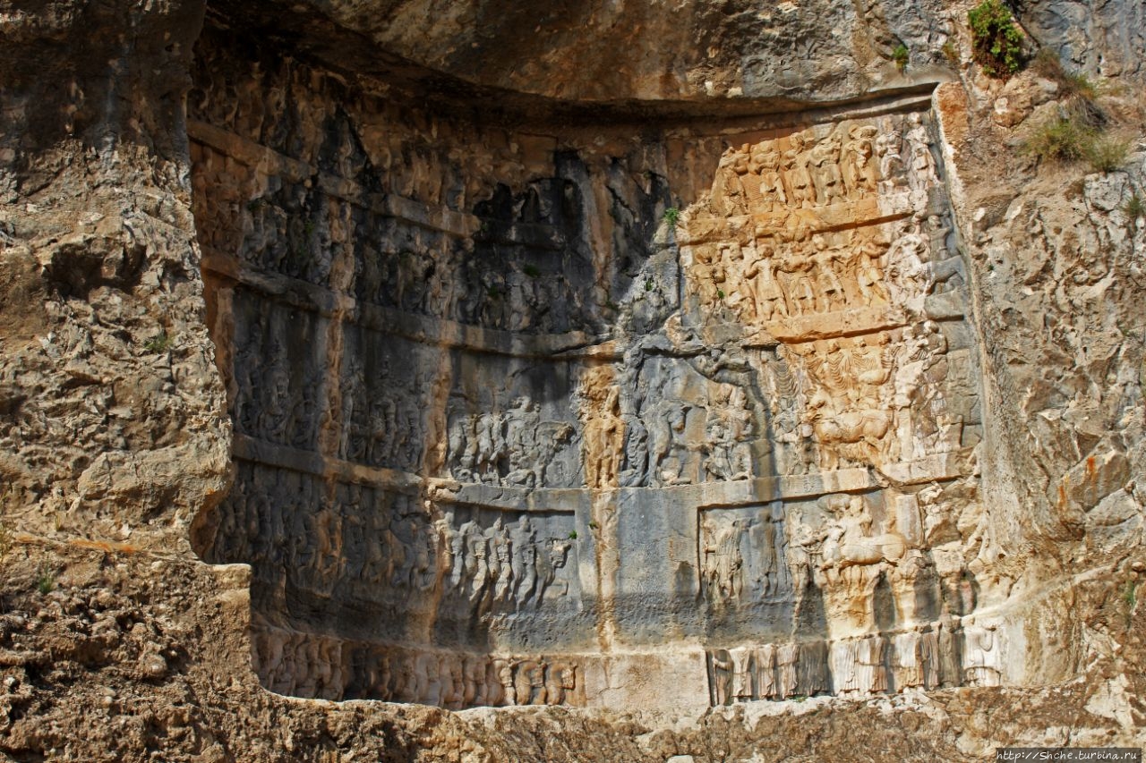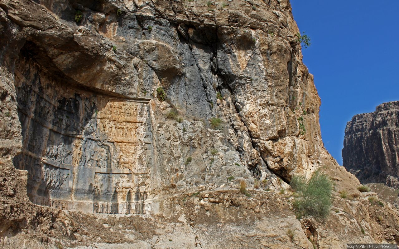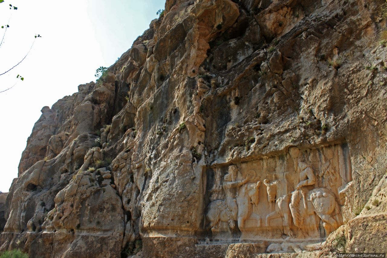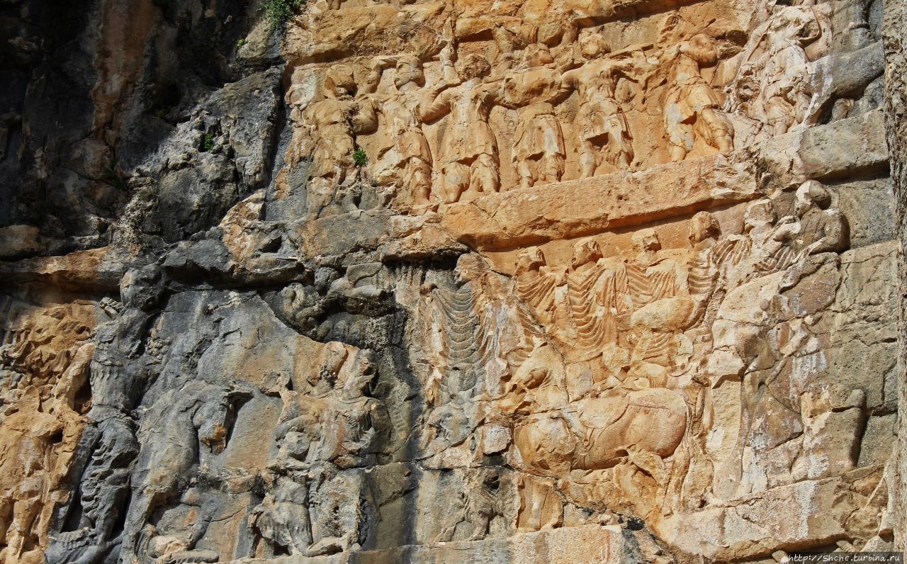 Тут требуется небольшой исторический экскурс. Эти рельефы, как я писал, были сделаны персами в 3-4 веке. Город Бишапур в 7 веке был захвачен арабами, которые проживали в нем примерно до десятого века. Арабы в город из ущелья по правой стене протянули акведук, причем сохранение персидских барельефов у них явно в приоритетах не значилось. Потому на это рельефе в нижней части хорошо видна борозда, которую проделали в стене арабы. Эту же борозду мы будем видеть еще на двух "каменных полотнах".