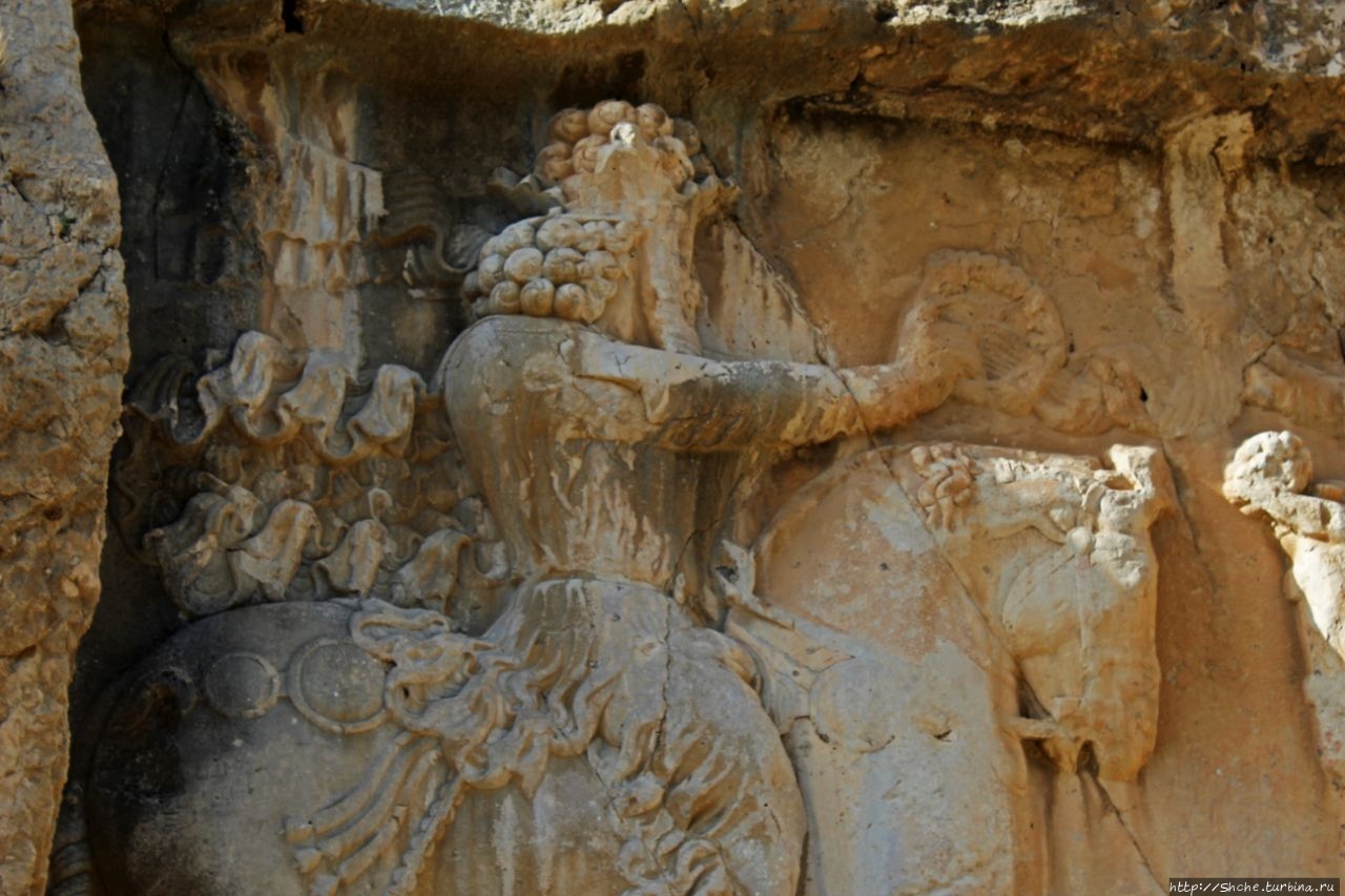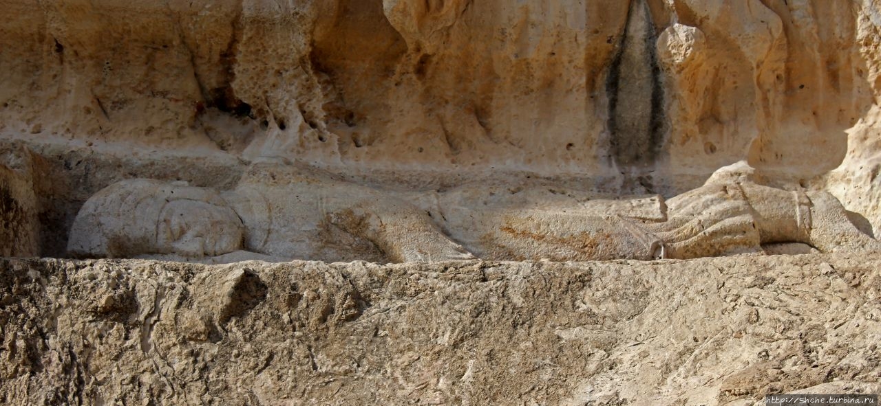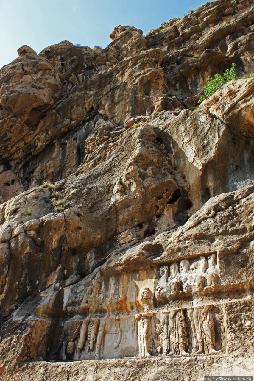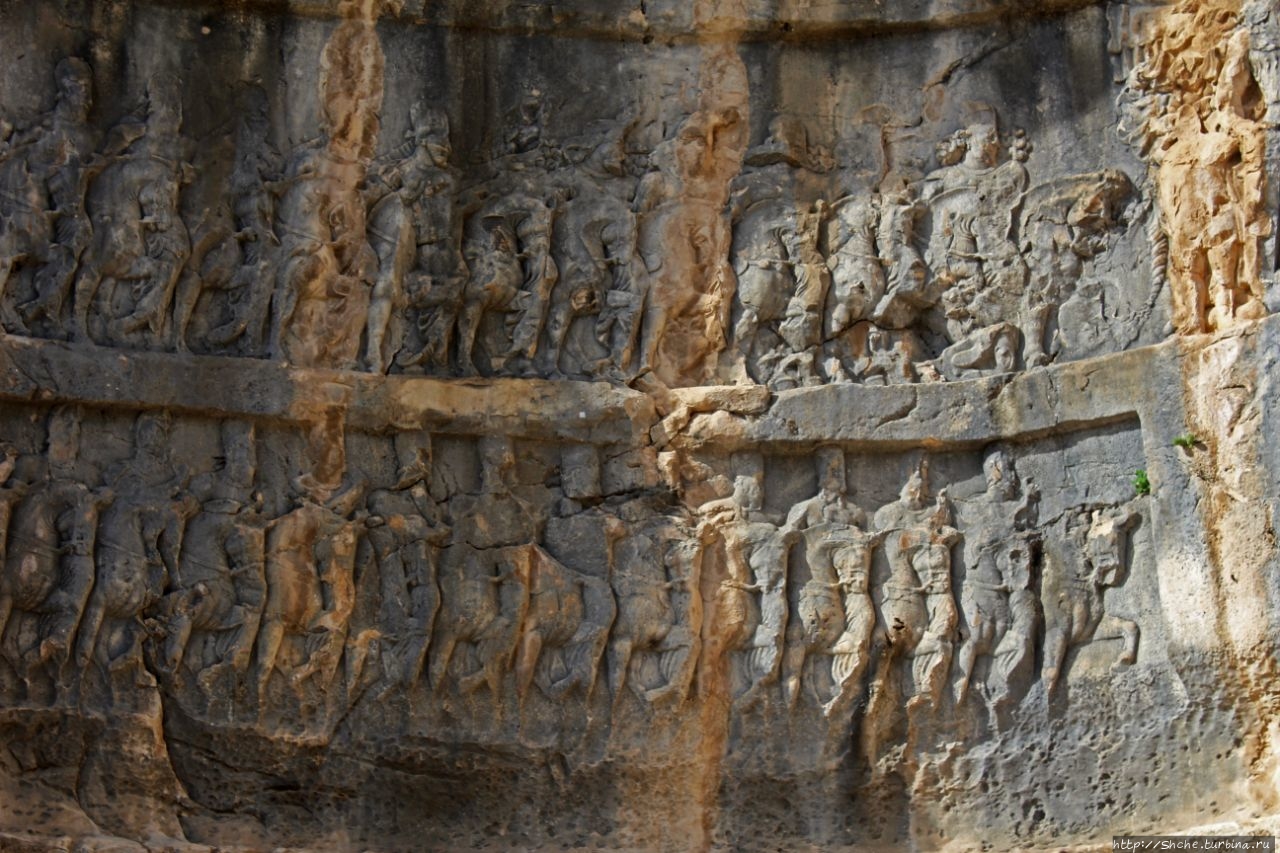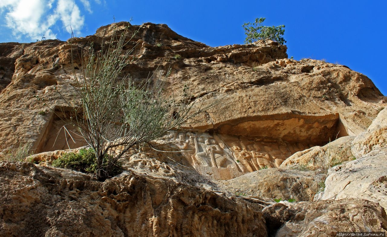 Тут требуется небольшой исторический экскурс. Эти рельефы, как я писал, были сделаны персами в 3-4 веке. Город Бишапур в 7 веке был захвачен арабами, которые проживали в нем примерно до десятого века. Арабы в город из ущелья по правой стене протянули акведук, причем сохранение персидских барельефов у них явно в приоритетах не значилось. Потому на это рельефе в нижней части хорошо видна борозда, которую проделали в стене арабы. Эту же борозду мы будем видеть еще на двух "каменных полотнах".